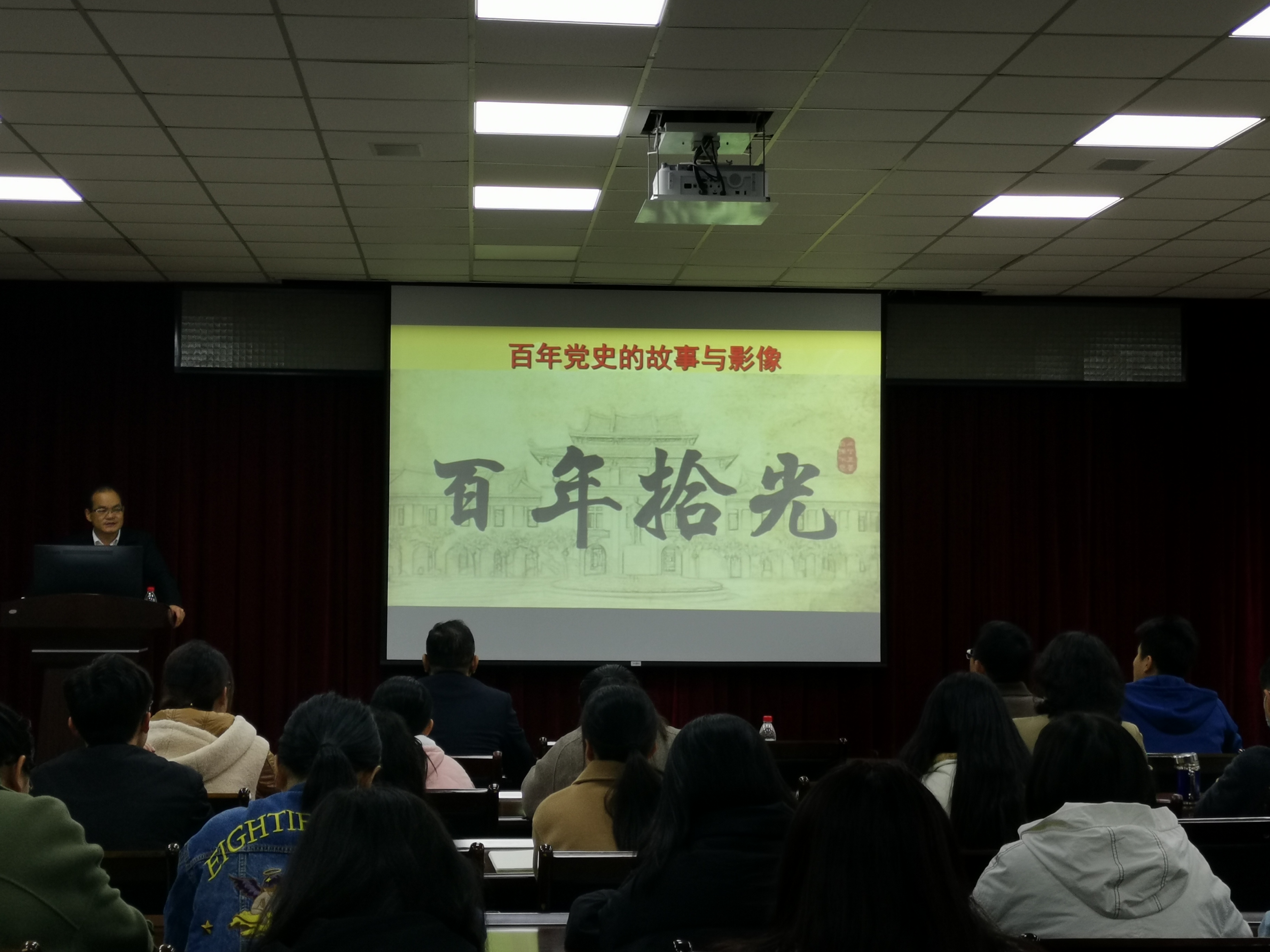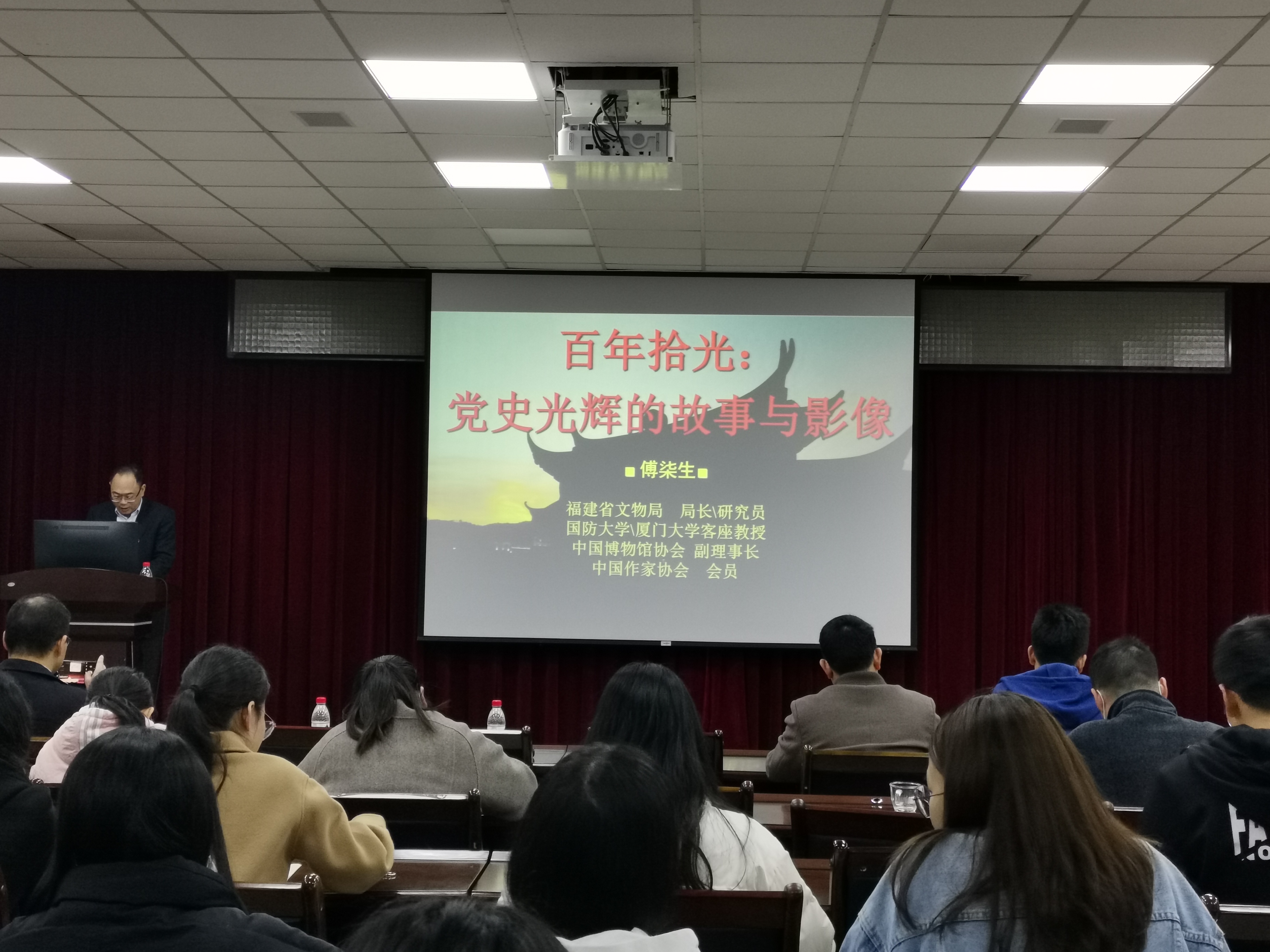 党史教育报告在嘉锡楼413举行,特别邀请了福建省文化和旅游厅党组成员、福建省文物局局长傅柒生教授做题为《百年拾光:党史光辉的故事与影像》的报告。学院党委委员、全体政工干部、师生党支部书记到场聆听了此次报告会,报告会由石炳文书记主持。