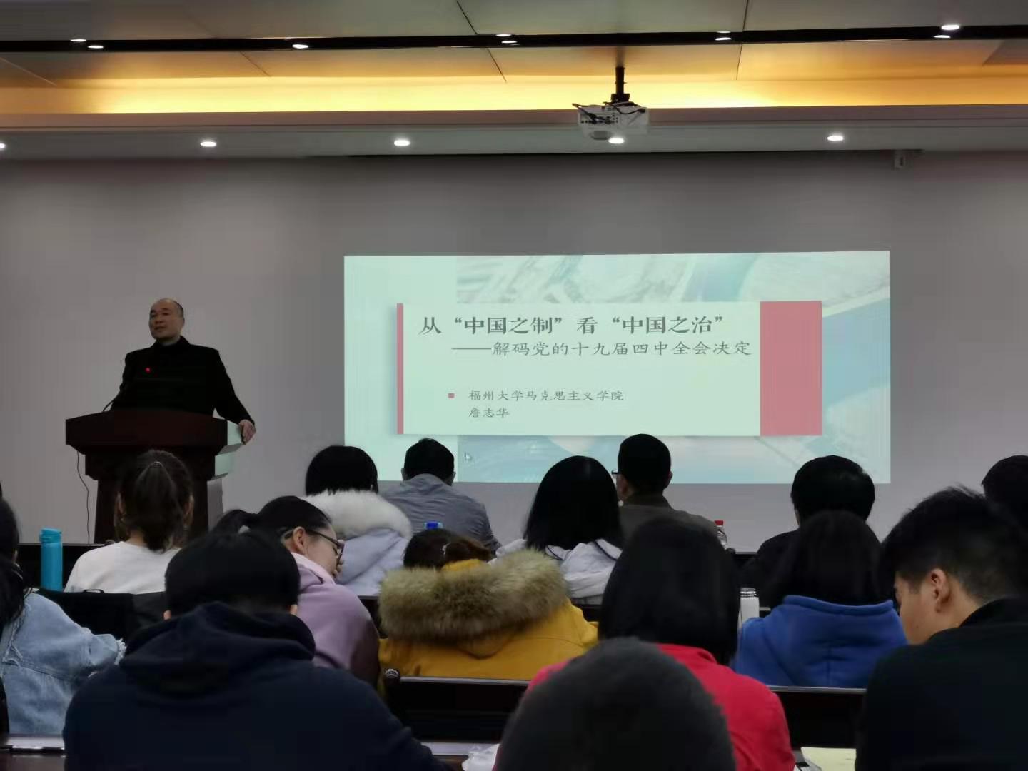 学习贯彻十九届四中全会精神宣讲团成员、马克思主义学院副院长詹志华教授做宣讲报告,学院党委书记石炳文同志主持报告会,学院师生代表参加了此次报告会。