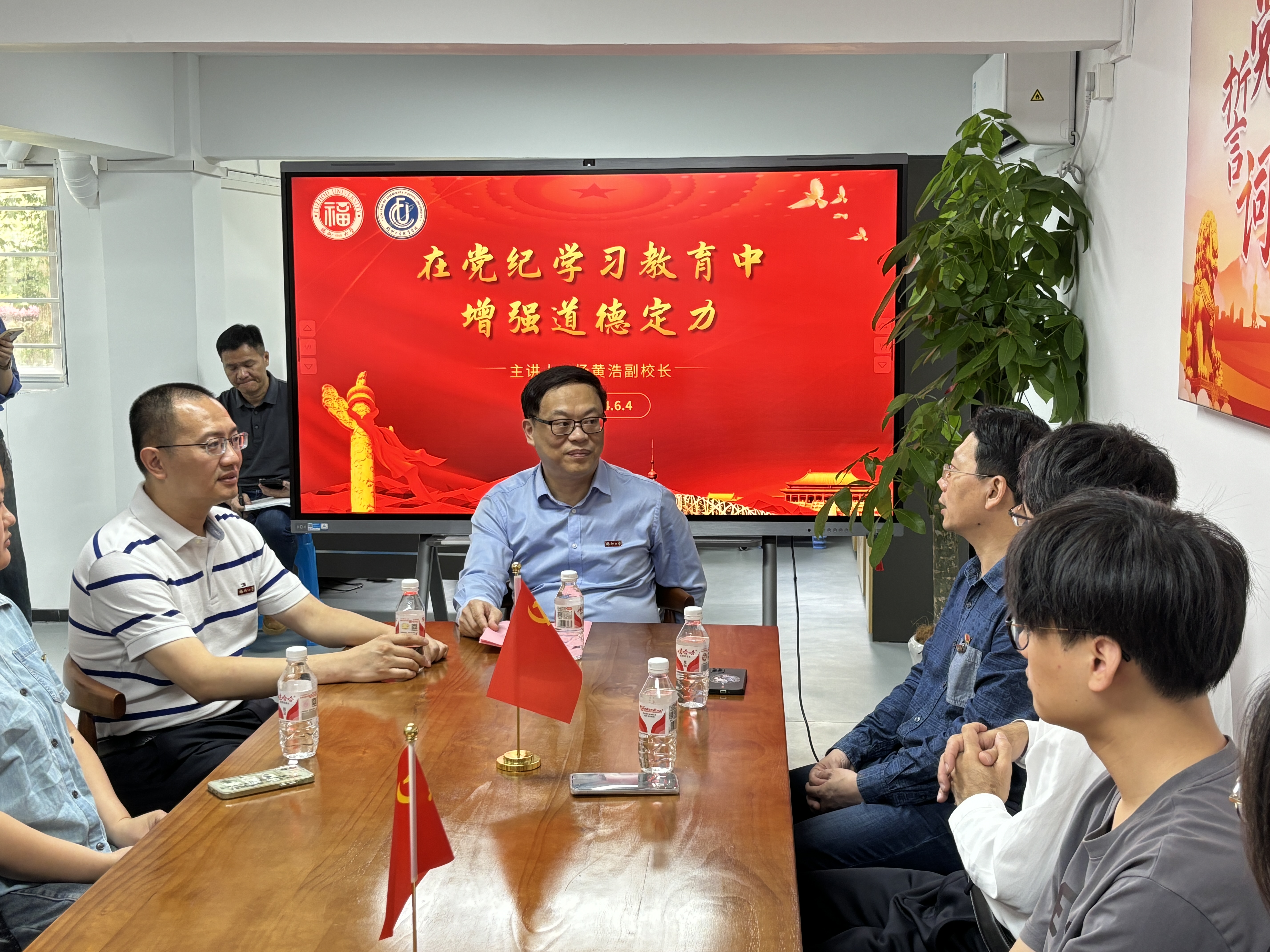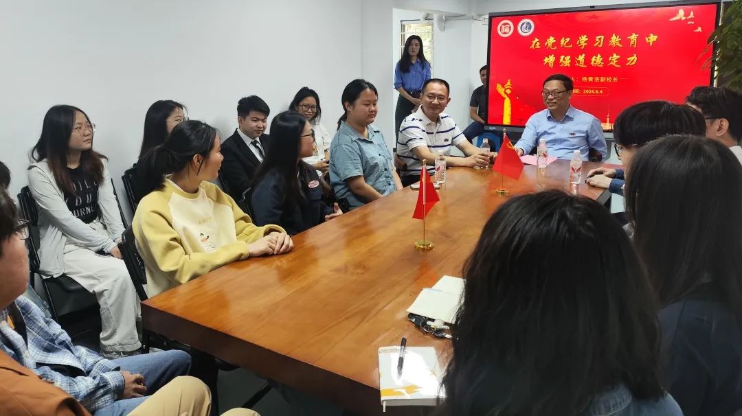 在党团活动室,杨黄浩副校长为联系的研究生社区上题为《在党纪学习教育中增强道德定力》的党纪学习教育专题党课(思政课),并与师生代表座谈交流。他强调,作为新时代的研究生,不仅要追求学术上的卓越成就,更要在思想政治上不断加强自身建设,深入学习习近平新时代中国特色社会主义思想,以此武装头脑,指导实践,推动科研工作。同时,杨副校长鼓励同学们在专注专业学习的同时,也要培养深厚的哲学素养,通过研读经典著作、参与哲学研讨等途径,不断丰富自身的知识储备,提升超前思维能力,实现个人素质的全面提升。