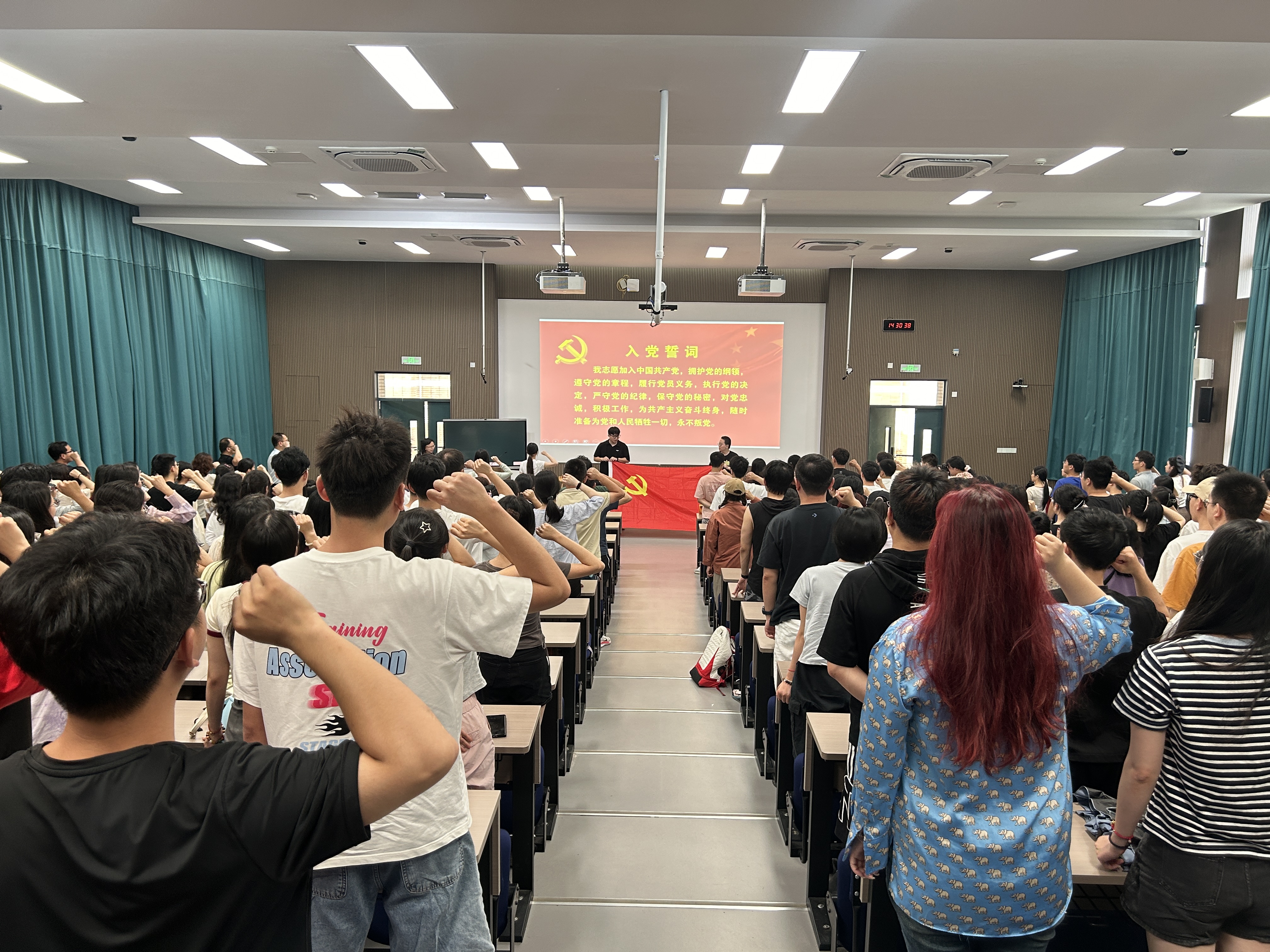 随后,毕业生党员代表江倍珊带领全体毕业生党员重温入党誓词,党员们高举右拳,面向党旗庄严宣誓,在铮铮誓言中回望入党初心,坚定理想信念,铿锵豪迈的声音彰显着每一位毕业生党员奔赴远方的使命和担当。