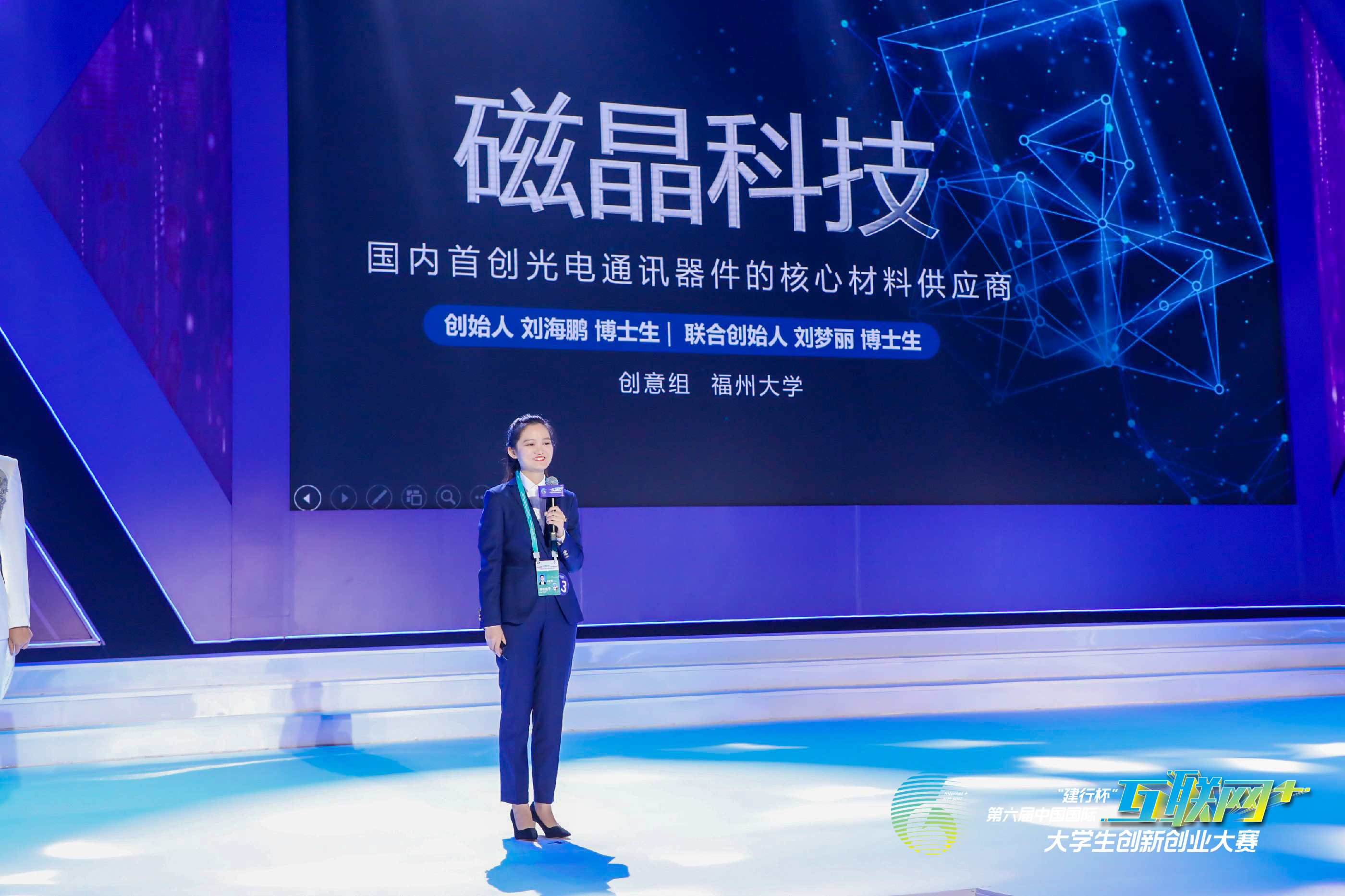 从科研报国、求学报国,到实干报国,刘梦丽紧跟前沿科技,成功孵化磁晶科技初创企业,实现产学研融合。为了推进项目落地,她参加了上百场创业培训课,自学经济和管理学。作为项目联合创始人、主讲和答辩,在第六届中国国际“互联网+”大学生创新创业大赛中,她摘得全国金奖,进入全国三强争霸赛,被主持人评为“有颜值又有实力的女博士”。此外,在“互联网+”省赛、“创青春”福建省青年创业大赛等多项创新创业比赛中,获得3金2银4铜的好成绩。