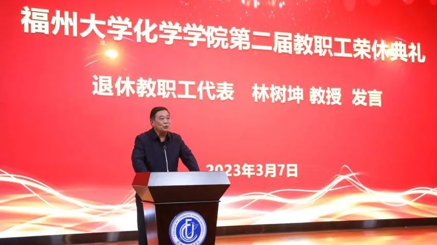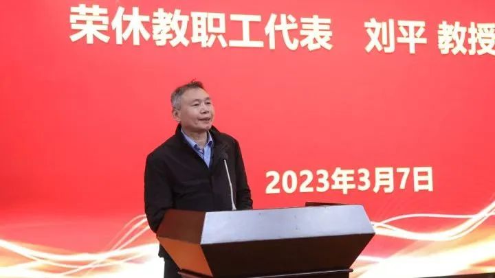 荣休教师代表刘平教授发言,他感叹时光如白驹过隙,回顾第一次上课的紧张,第一次见同事的激动,历历在目。感谢学院一直以来给予的关心和认可,并表示在乐享退休生活的同时,将一如既往地关注、支持学院的建设,期盼化院发展得越来越好。