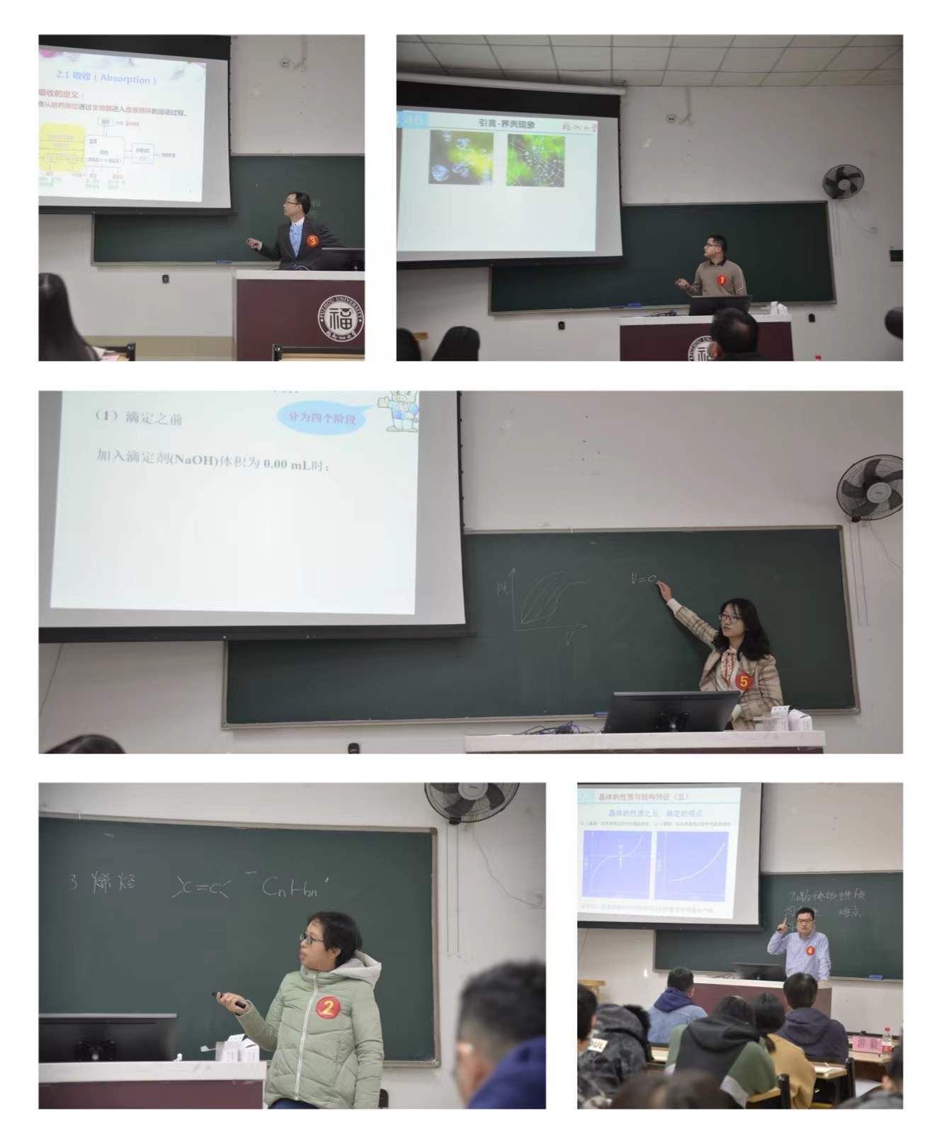 青年教师的教学风采。竞赛评委根据参赛教师的授课教案、教学组织、教学内容、语言与教态、板书和教学手段等各方面的表现情况进行实名制打分。组长阮奇老师对每位比赛选手的表现作了精彩点评,从课程思政到案例教学,从语言神态到教具选用,阮奇老师都做了细致入微的指导,在场师生受益匪浅。经过激烈角逐,物化系的汤禹老师、有机系的李毅老师脱颖而出,分别获得一等奖和二等奖的好成绩,其余三位老师获得三等奖。