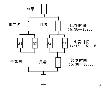 2、小组循环赛前两名出线,第二阶段甲、乙小组胜者进入半决赛、交叉进行(即A1—B2,B1—A2)。再胜者进入冠、亚争夺,负者争第三名。