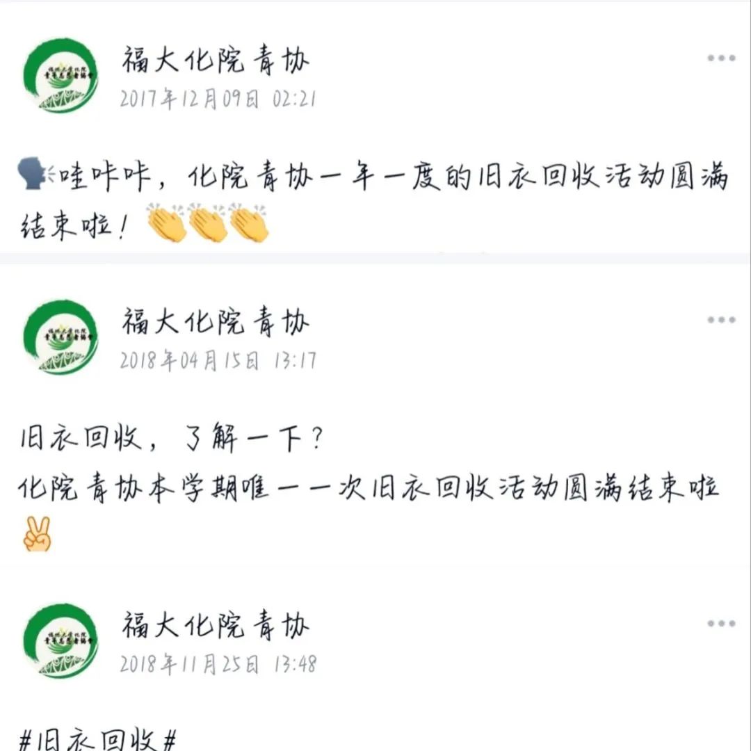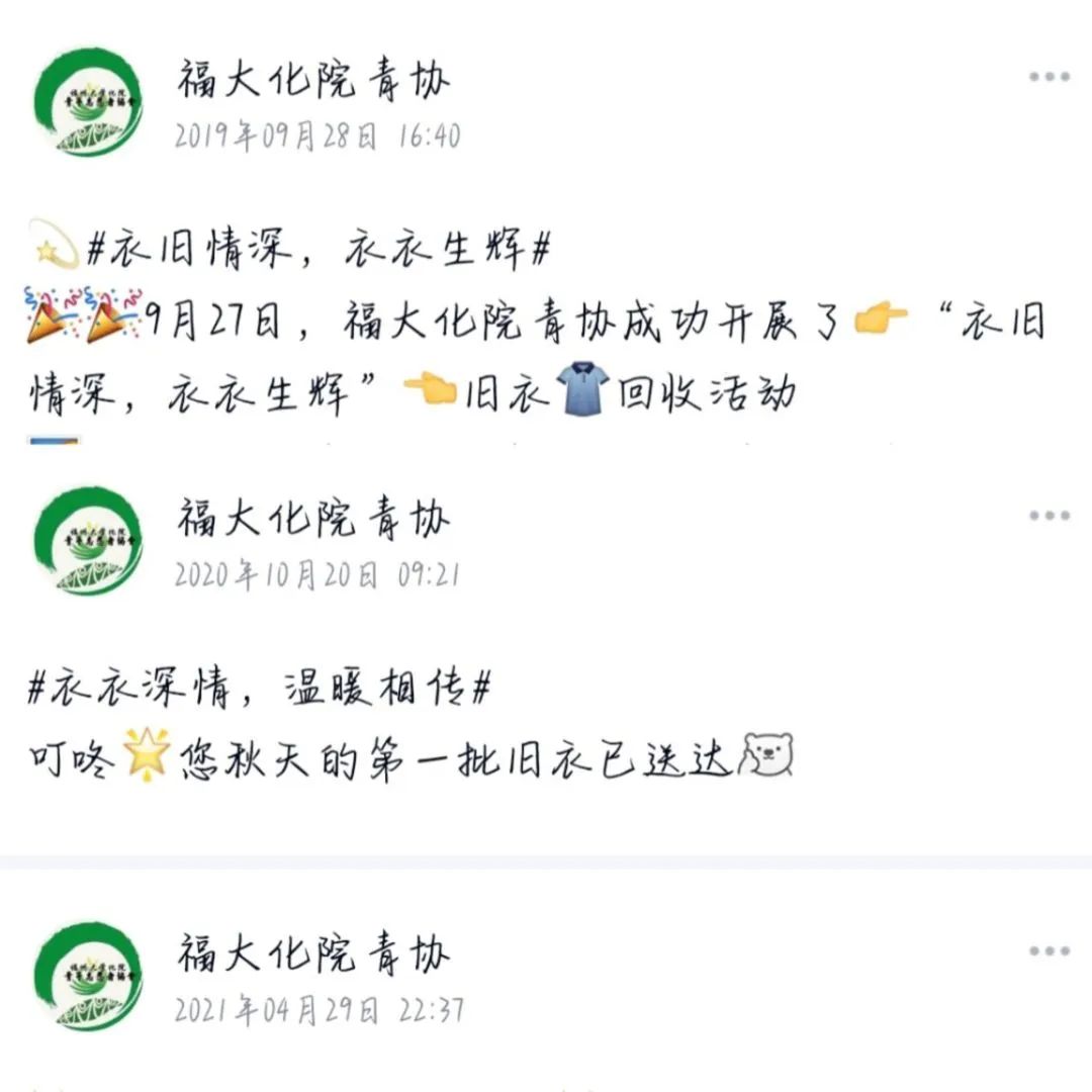 回收的不仅是衣物,更是我们爱心的温度。未来,化院青协也将继续发扬志愿精神,为同学们服务,为社会服务。也希望同学们能够积极加入我们,多多参与公益活动,通过一件件小事,将爱传递,让世界更加温暖美好!