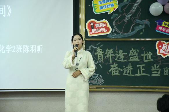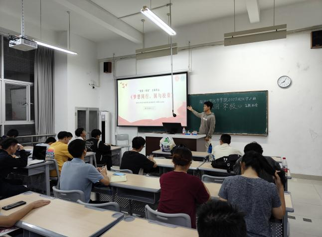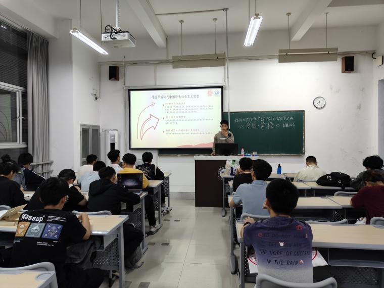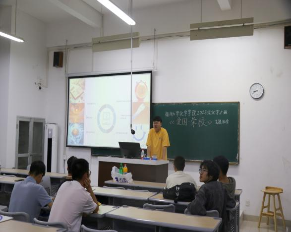 于2023年11月4日组织“爱国荣校”交流会。2023级化学二班班长程子禾、团支书郑炜民等主要学生干部依次上台分享自己的成长经历以及感悟,以生动实例带领同学们体会近十年国家的建设与进步,引发同学们的共鸣。