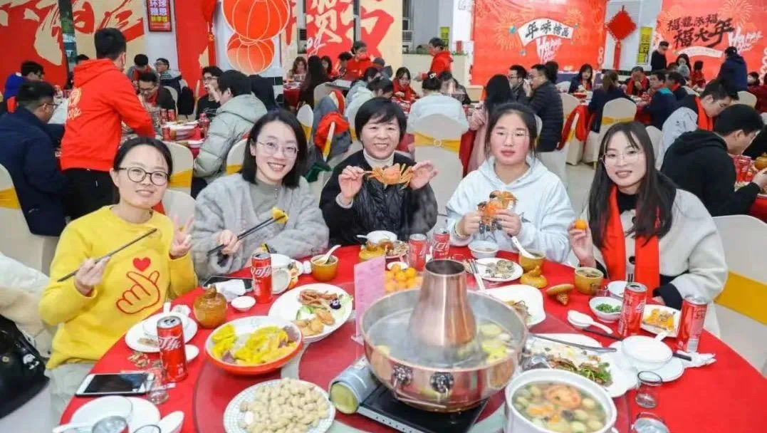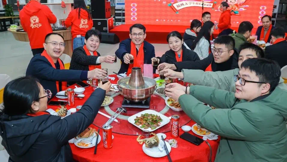 除夕当天,留校学子来到精心装点的玫瑰园写对联、领奖券、抽好礼、包饺子,观看精彩纷呈的舞台表演,喜气洋洋的食堂充满欢声笑语,洋溢着满满的“年”味 。除夕夜,留校师生欢聚一堂,共享色味俱佳的年夜饭。校党委陈国龙书记、黄身勇副书记、郭文忠副校长、夏帆副校长为留校师生送上新春祝福,学院党委副书记常凯、团委书记刘旭莹与学院留校学子同桌吃饭。佛跳墙、太平燕、年糕...饱含着最诚挚美好的祝福,让每一位留校学子感受中国年的温暖和热闹。