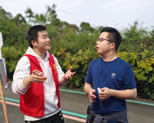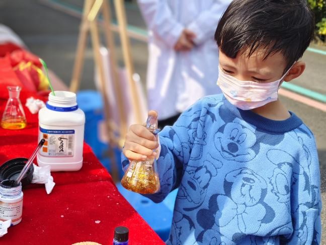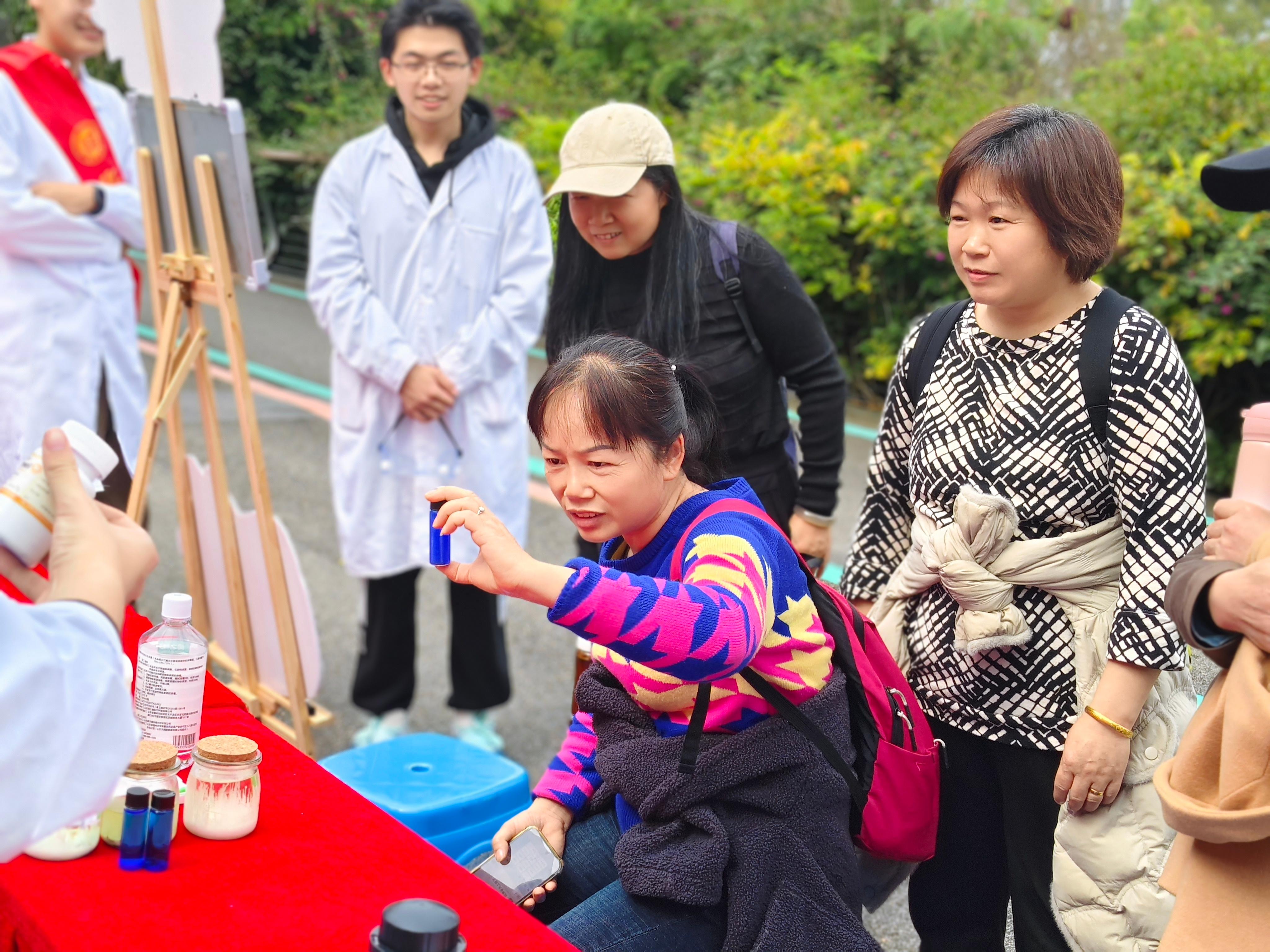 “你们瞧,现在是绿色对吧,我让它照照太阳,吸收吸收能量。哎,你看!它就变黄了。再来,我把它放在红色的桌布上让它吸收吸收红色,呦!又变红了。”嘉锡青年们将“红绿灯”实验以化学“魔术”的形式向路人们展示,奇妙有趣的实验现象搭配生动活泼的语言,引得路人纷纷鼓掌叫好。