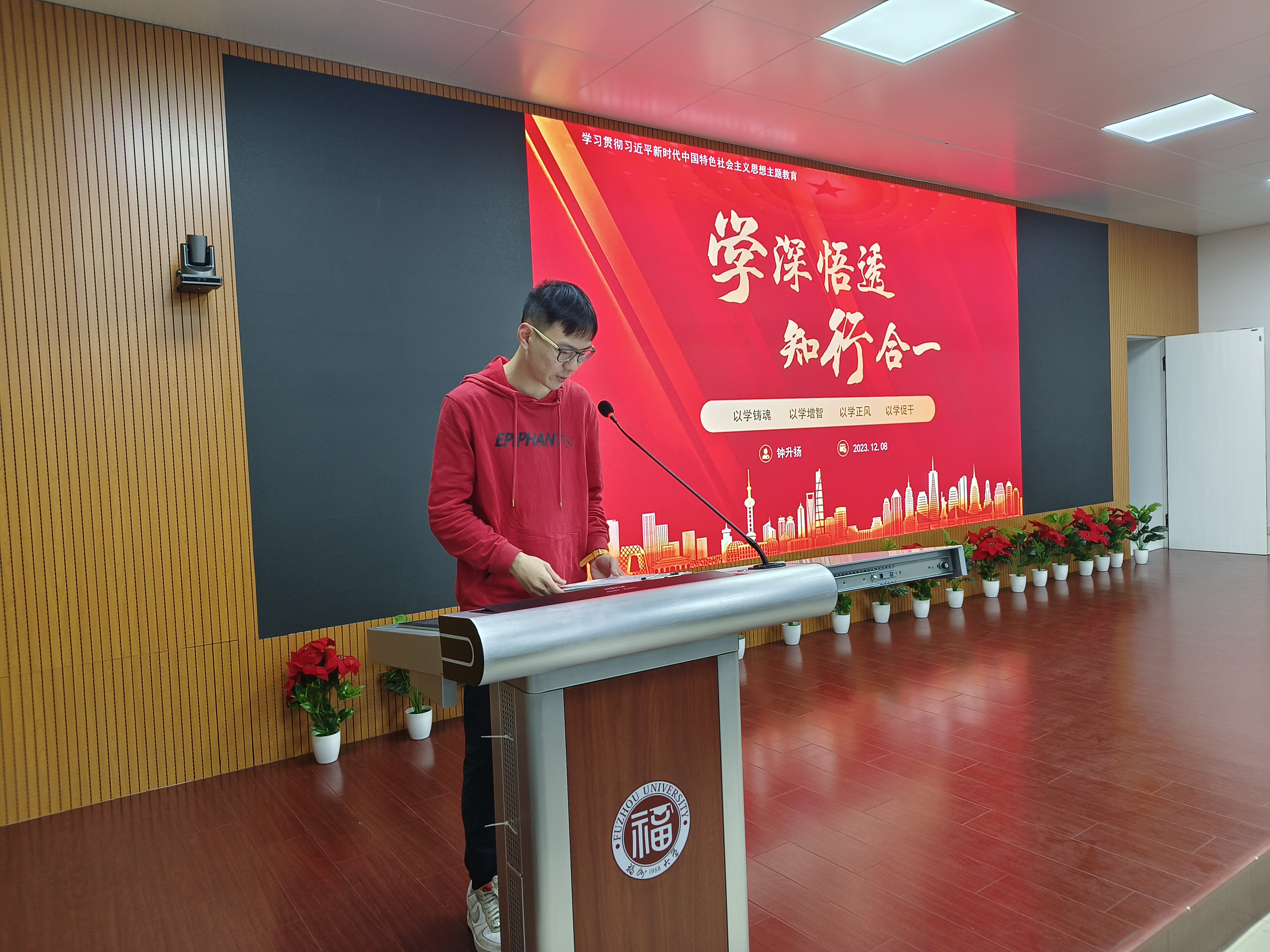 本科学生团委副书记钟升扬以“学深悟透,知行合一”为主题进行领学交流,在谈到作为学生骨干的具体目标时,他说道:学生骨干应做到凝心铸魂筑牢根本 、锤炼品格强化忠诚 、实干担当促进发展 、践行宗旨为民造福 、廉洁奉公树立新风,深刻贯彻党的宗旨,全心全意为人民服务。