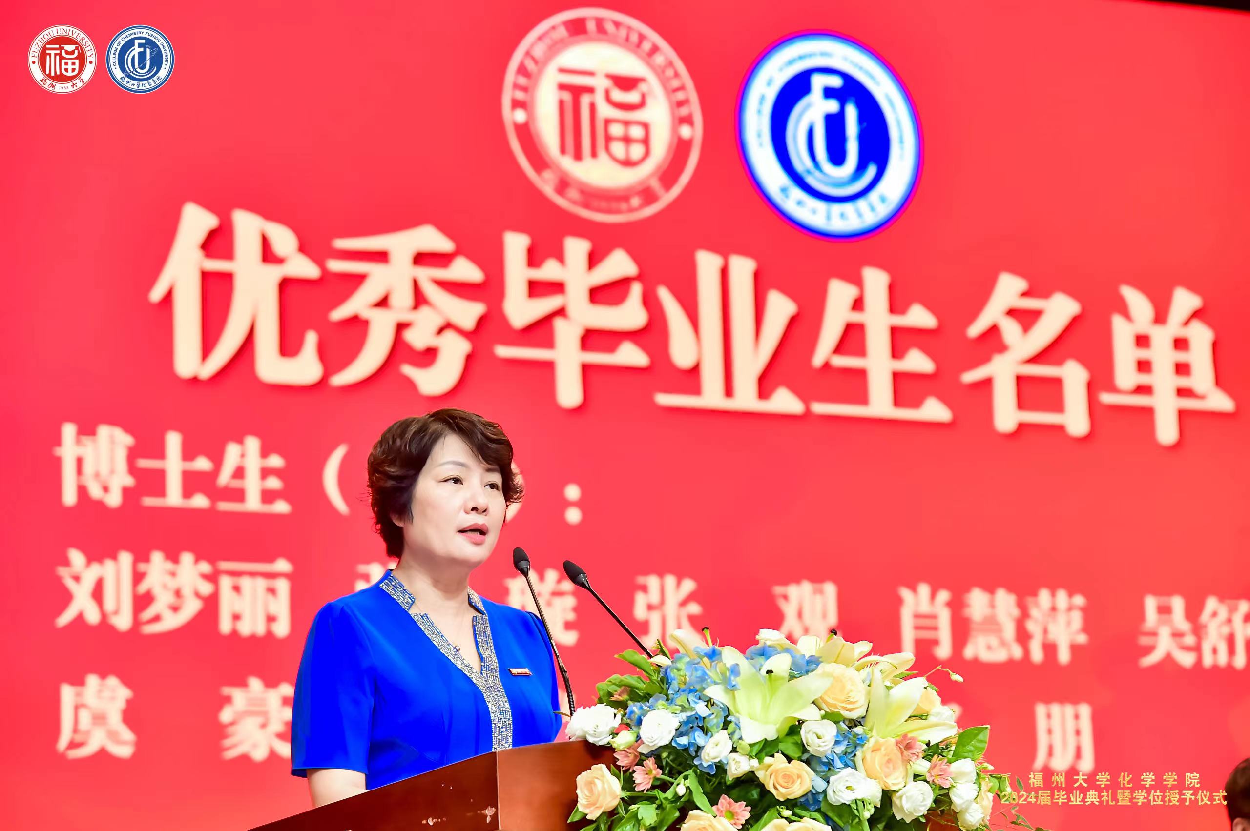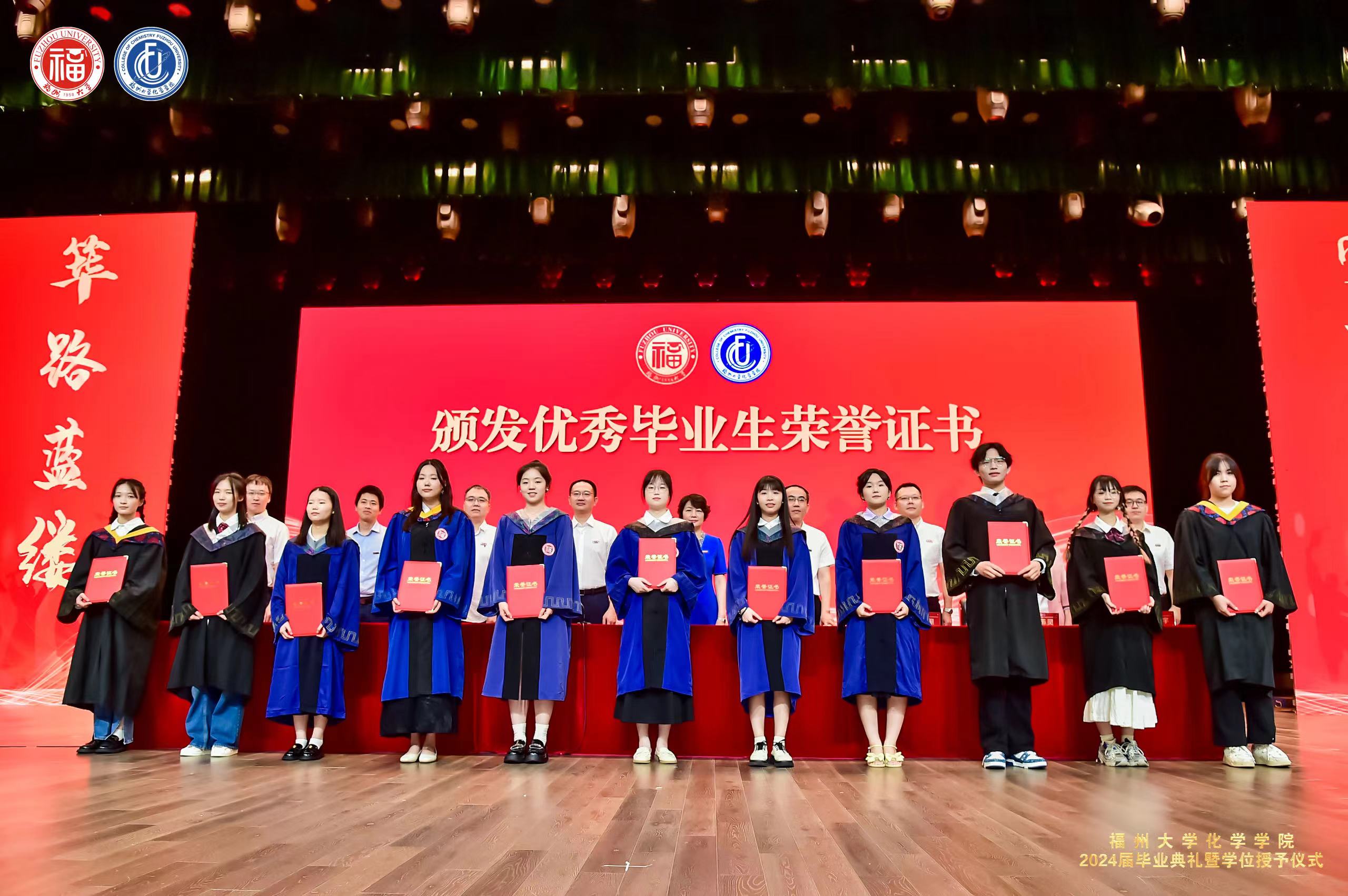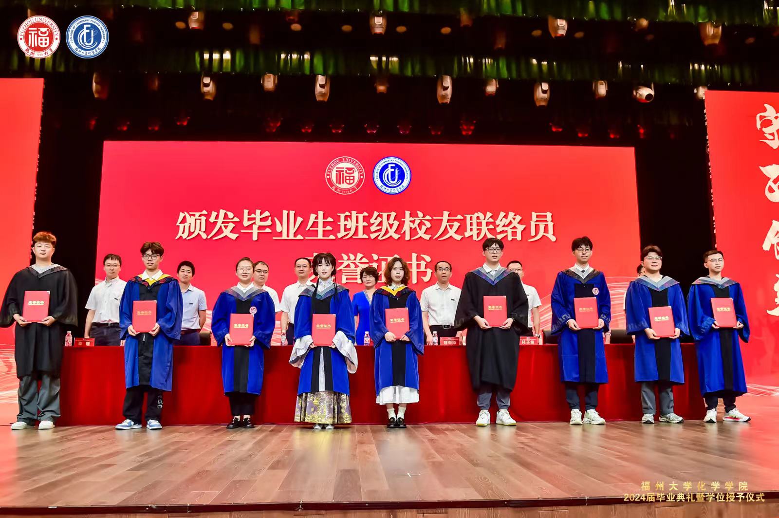 院党委张泓书记宣读2024届拟授予博士、硕士、学士学位毕业生名单,优秀毕业生名单,班级校友联络员名单。主席台嘉宾为优秀毕业生代表和班级校友联络员代表颁发荣誉证书。