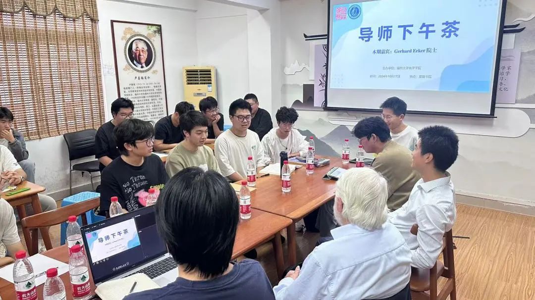学业发展部主办的导师下午茶活动在“一站式”学生社区嘉锡书院成功举行。德国科学院院士、欧洲科学院院士、德国明斯特大学的Gerhard Erker教授和学院国家级青年人才、院长助理叶克印教授做客本期导师下午茶,辅导员陈日懿老师和学院嘉锡化学拔尖班学生代表全程参加。