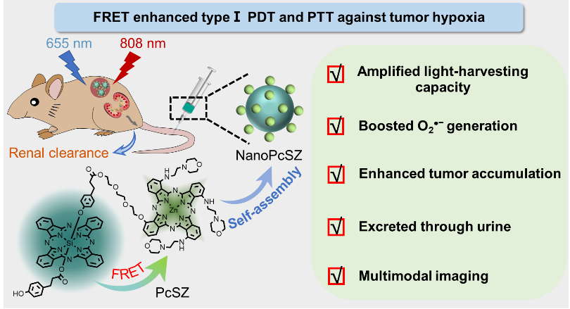 成果以“A Renal Clearable Nano-Assembly with Förster Resonance Energy Transfer Amplified Superoxide Radical and Heat Generation to Overcome Hypoxia Resistance in Phototherapeutics”为题发表在Angew. Chem. Int. Ed.上。91快活林