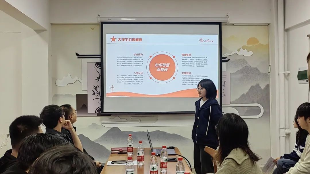 心理委员高语熙从大三的学习生活现状引入,分析了大学生现如今常见的压力来源,提出了维持大学生心理健康需要“提升幸福感”的观点。随后他结合生动的视频介绍了“三件好事”、“日行一善”等“获得幸福感”的技巧,帮助同学们在校园里用心学习、幸福生活、共同成长。