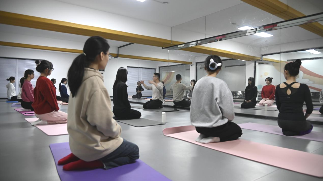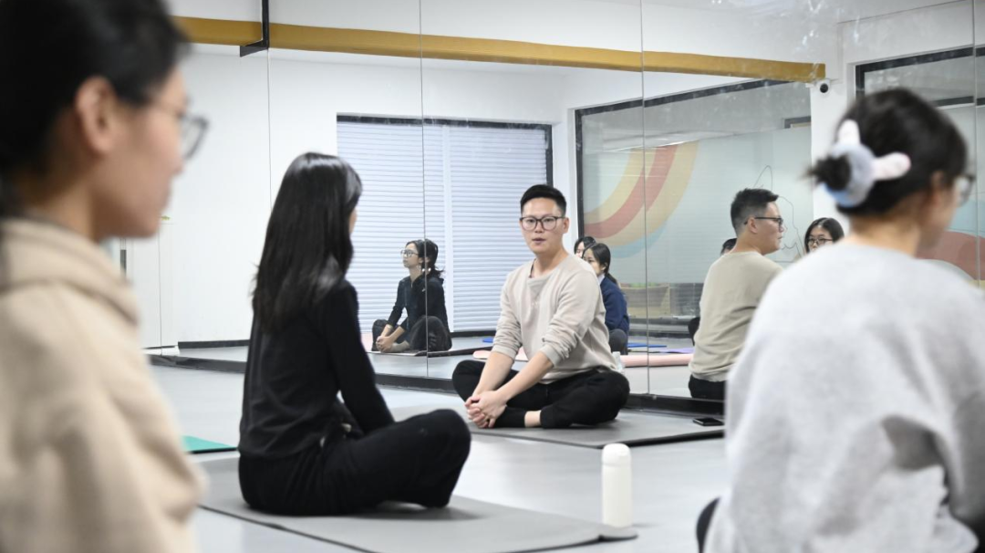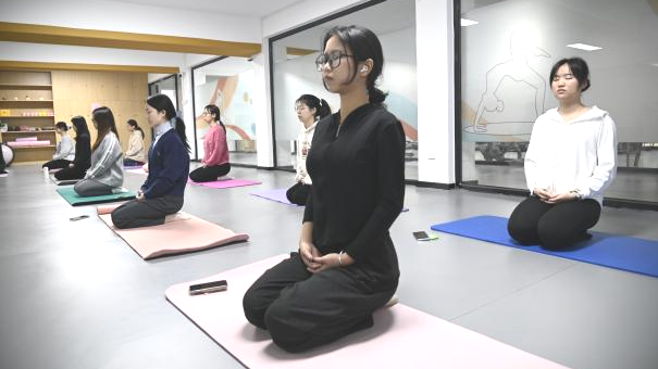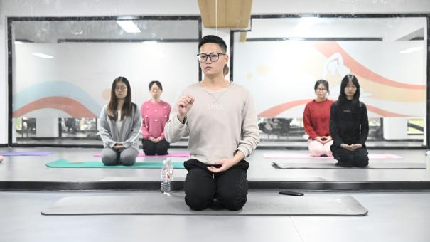 呼吸和冥想是瑜伽课程中的重要组成部分,它们可以帮助我们减轻压力、焦虑和疲劳,提高睡眠质量,增强免疫力。陈老师引导同学们进行深呼吸练习,让大家学习如何通过呼吸来调节身体进而让思绪逐渐平静下来,达到内心的宁静。