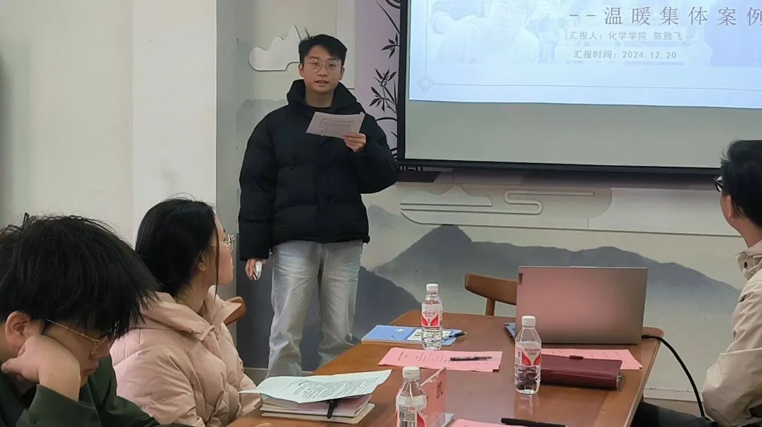 陈腾飞同学以“温暖集体,爱在福大”为主题,从送医、关怀到助其康复回归,讲述了2022年10月制药工程班小庚同学体测受伤后全班同学共同提供帮助的事例,强调了营造暖心班风的重要性。班级也因此获评91快活林