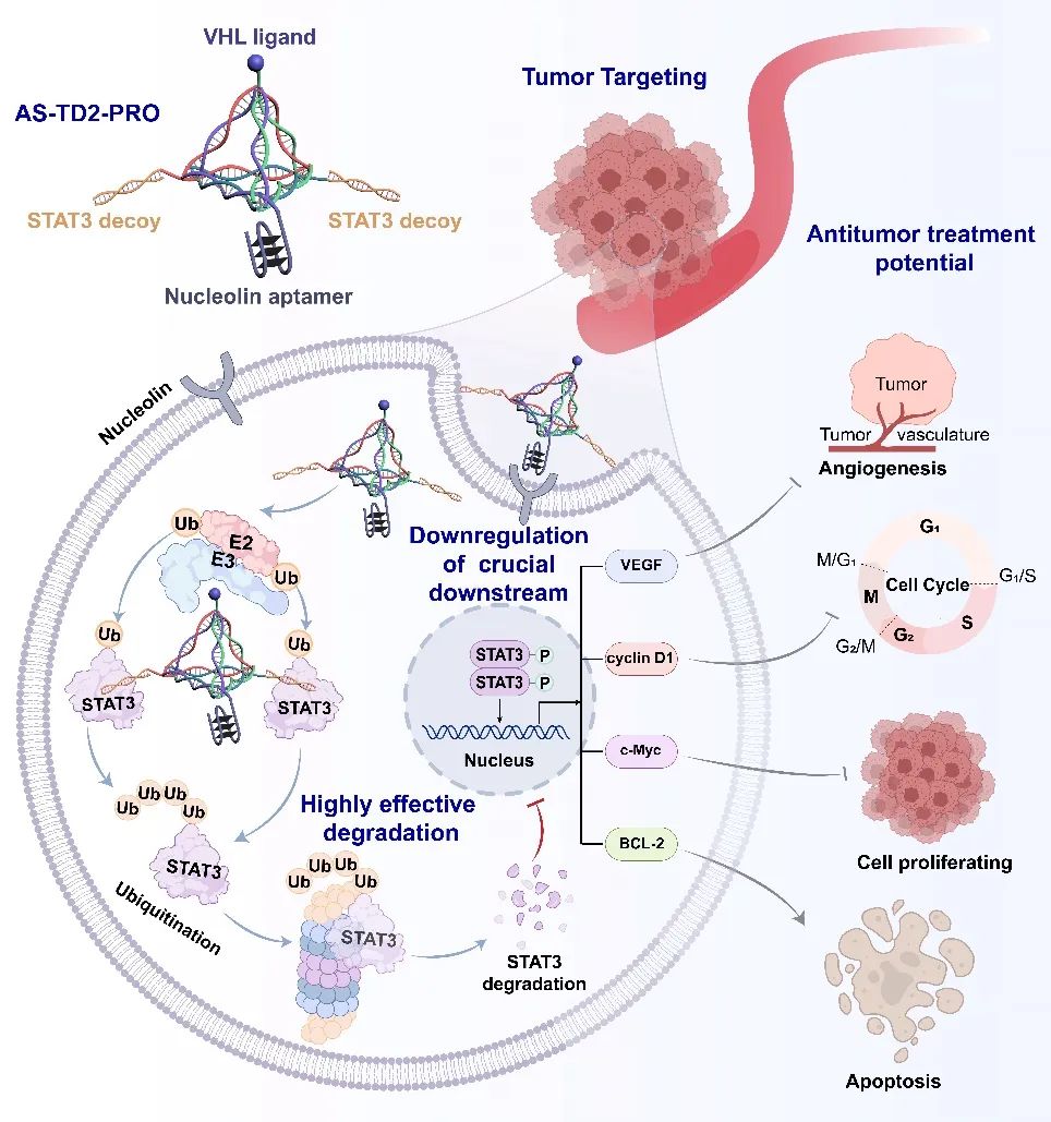 蛋白水解靶向嵌合体(PROTACs)是一种双功能分子,由目标蛋白结合配体、E3连接酶结合配体和连接子组成,能够同时招募目标蛋白和E3连接酶,标记目标蛋白进行泛素化后被蛋白酶体降解,在疾病治疗中展现出巨大的应用潜力。与传统抑制剂相比,PROTAC在催化活性、选择性、克服耐药性及靶点阻断等方面具有显著优势。然而,如何通过连接子设计和配体修饰构建多功能平台,以提高降解效率和抗肿瘤活性,仍是PROTACs开发面临的重大挑战。DNA四面体作为一种可编程且可修饰的纳米材料,能够精确组装、选择性识别分子并灵活调节分子间的距离,是理想的连接子。与传统的柔性PEG接头相比,基于双链DNA的刚性接头能有效保持稳定构象,减少脱靶效应。因此,研究人员利用DNA四面体开发了一种多价PROTAC(AS-TD2-PRO),通过连接肿瘤细胞靶向模块、E3泛素连接酶和目标蛋白模块,增强了肿瘤特异性靶向性和降解效率。以不可成药的靶蛋白—信号转导及转录激活因子3(STAT3)为例,AS-TD2-PRO在小鼠肿瘤模型中展现出卓越的治疗效果。这一研究为癌症治疗提供了前景广阔的策略。