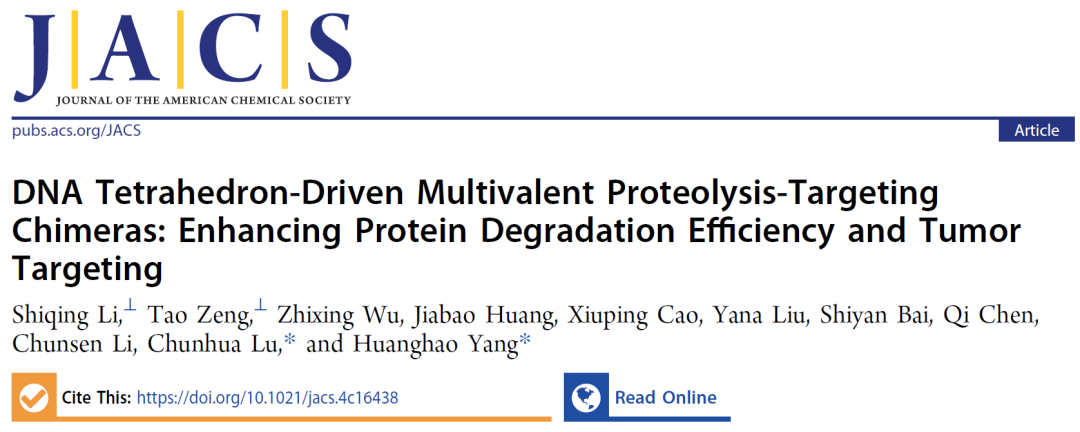 卢春华/杨黄浩课题组在Journal of the American Chemical Society上在线发表了题为“DNA Tetrahedron-Driven Multivalent Proteolysis-Targeting Chimeras: Enhancing Protein Degradation Efficiency and Tumor Targeting”的研究论文。在本文中,研究团队开发了一种基于 DNA 四面体的多价蛋白水解靶向嵌合体(PROTACs,AS-TD2-PRO),相较传统二价 PROTACs 展现出更强蛋白降解潜力,为癌症治疗提供了新思路。