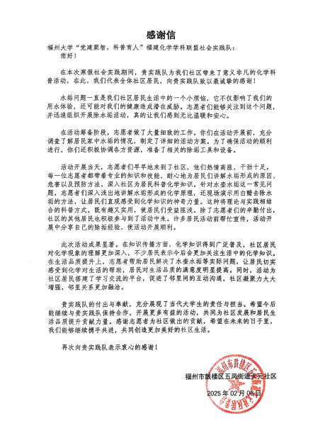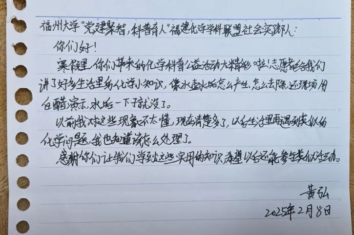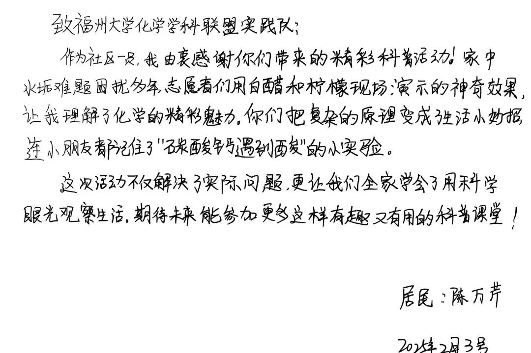 “党建聚智,科普育人” 福建化学学科联盟社会实践队的活动,犹如一抹温暖而明亮的光,照亮了社区的每一个角落。他们将化学知识精心包装,化作一场场生动有趣的科普盛宴,送到社区居民的身边。实践队的队员们耐心讲解化学原理,亲手演示奇妙的化学反应,让居民们亲眼见证科学的神奇。这不仅让居民们学到了实用的化学知识,更在大家心中种下了科学的种子。相信在新的一年,随着这颗种子生根发芽,会有越来越多的人关注科学、热爱科学,让科学知识成为生活的智慧源泉,为生活增添更多的精彩与可能。