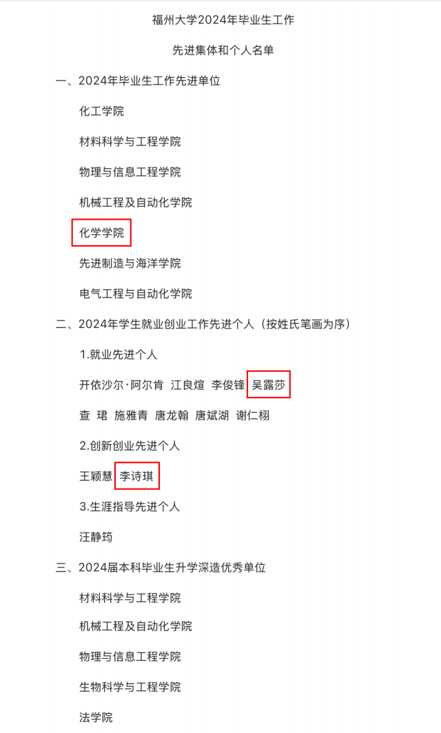 荣获“2024年毕业生工作先进单位”称号;吴露莎老师荣获“2024年学生就业创业工作先进个人(就业先进个人)”称号;李诗琪老师荣获“2024年学生就业创业工作先进个人(创新创业先进个人)”称号。