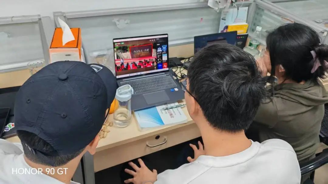 4月23日上午9:15,学院采取“集中+分散”相结合的方式组织观看。部分班级在学院会议室、多媒体教室集中观看直播,现场氛围庄重热烈;其他学生则通过人民网、新华网等平台自行学习。直播中,同学们认真聆听“向下扎根,向上生长”的主题分享,深刻感悟红色精神与新时代青年使命的结合,进一步坚定了扎根祖国大地、服务国家战略的理想信念。