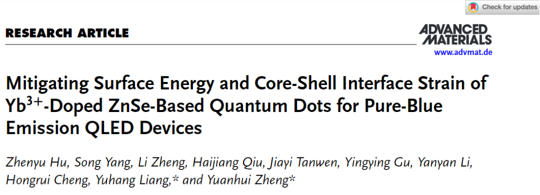 “Mitigating Surface Energy and Core–Shell Interface Strain of Yb3+-Doped ZnSe-Based Quantum Dots for Pure-Blue Emission QLED Devices”, Zhenyu Hu, Song Yang, Li Zheng, Haijiang Qiu, Jiayi Tanwen, Yingying Gu, Yanyan Li, Hongrui Cheng, Yuhang Liang,* and Yuanhui Zheng* Advanced Materials, 2025: DOI: 10.1002/adma.202501500