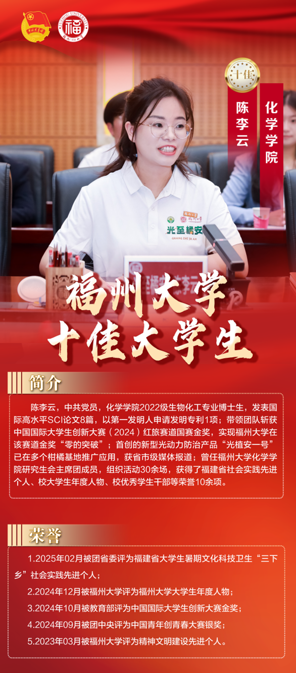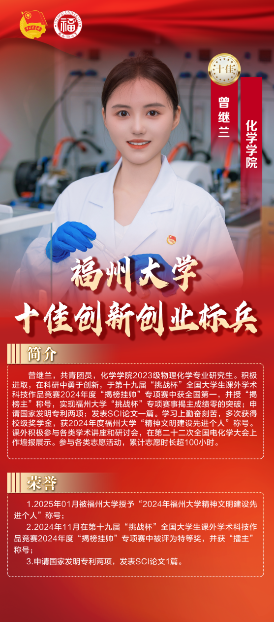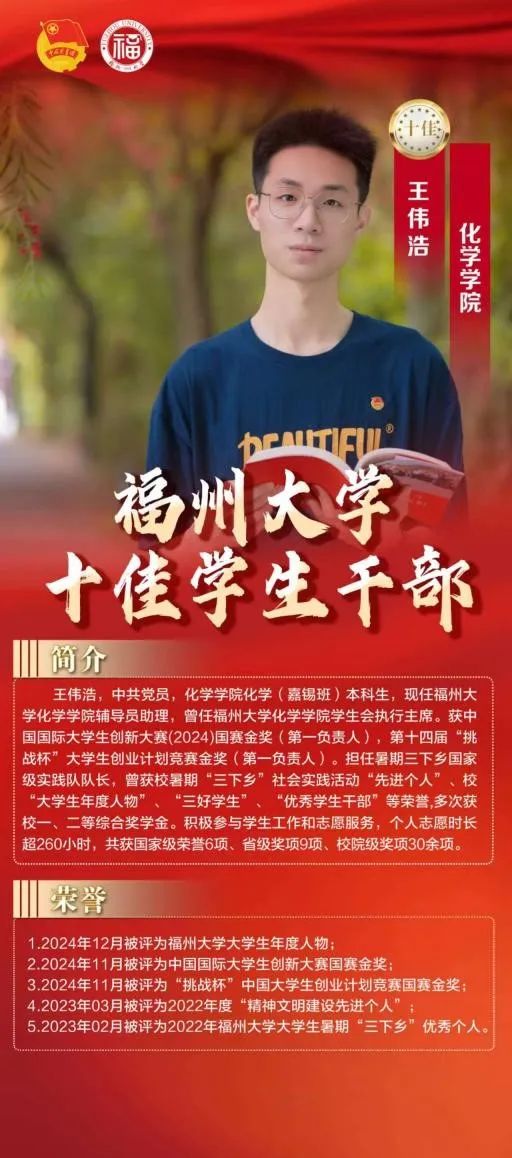 2022年优秀学生思想政治教育工作者等荣誉。思想上注重加强理论学习,努力提高个人修养;工作中忠于职守,开拓创新,勇于实践,言传身教,以身作则。长期负责学院创新创业工作,为学生提供三创的活动指导,激发学生参与三创活动的热情,进一步提升三创活力。在2024年“挑战杯”、创新大赛中,指导的项目共获得国赛1特4金2银1铜的好成绩,为我校捧得“优胜杯”做出重要贡献!