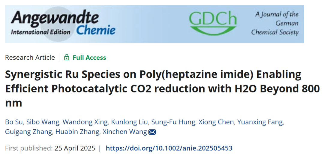 “Synergistic Ru Species on Poly(heptazine imide) Enabling Efficient Photocatalytic CO2 Reduction with H2O Beyond 800 nm”, Bo Su, Sibo Wang*, Wandong Xing, Kunlong Liu, Sung-Fu Hung, Xiong Chen, Yuanxing Fang, Guigang Zhang, HuabinZhang, Xinchen Wang*, Angew. Chem. Int. Ed. 2025, e202505453.DOI:10.1002/anie.202505453