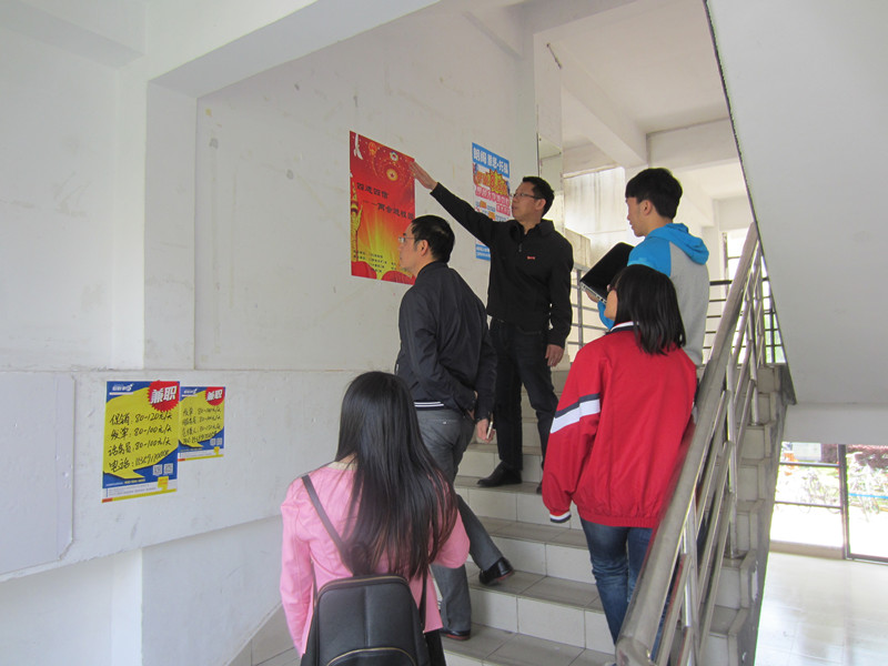 党委副书记刘旺,团委书记蓝荣聪、12级本科生辅导员杨意舒在团委学生会成员陪同下来到91快活林