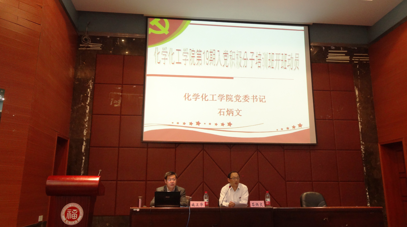 化学化工学院分党校第十九期入党积极分子培训班在嘉锡楼报告厅开班。出席本次开班仪式的有院党委石炳文书记,党委施卫华副书记,10级辅导员朱振宁,11级辅导员华琴,及学院入党积极分子90余人。