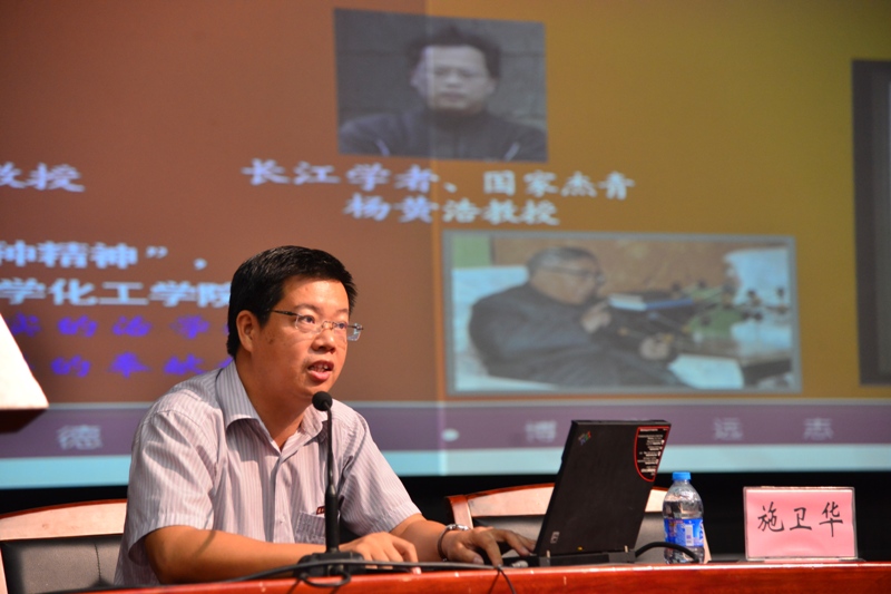 和化学化工学院、如何提升自我三个方面,图文并茂地向大家介绍了研究生培养模式与教育目标,展示了学院的师资力量与科研平台,着重以“认清现状、把握机会、求真至善、助力成功”为主题介绍了三点内容。一是,研究生面临的机遇与挑战。研究生应当适时调整心态,积极面对学习、生活、就业上的压力。二是,研究生需要具备的能力。研究生应当努力培养自主学习探索的能力、动手实践的能力,以及抗压力和抗挫折的能力。三是,研究生需要处理好几种关系,即研究生与导师的关系,学业与情感的关系,压力与动力的关系,志存高远与始于足下的关系。最后,施老师勉励大家做个立志青年,博学笃行,慎思明理,做个勤奋学子,面朝书海,扬帆启航。讲座在一片热烈的掌声中落下帷幕。