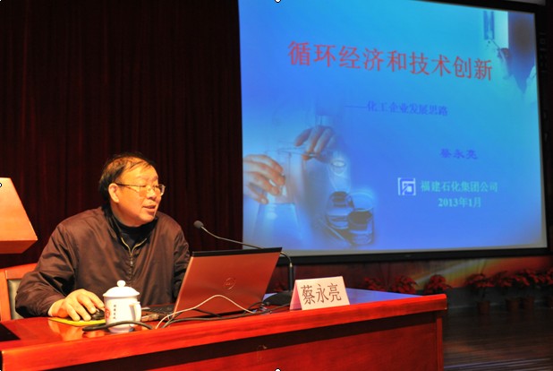 蔡永亮工程师先向大家介绍了循环经济的定义,他指出循环经济,是以资源的高效利用和循环利用为核心,以“减量化、再利用、资源化”为原则,以低消耗、低排放、高效率为基本特征,是对“大量生产、大量消费、大量废弃”的传统增长模式的根本变革,符合可持续发展的理念。随后,他以其独到的企业理念与切身的项目经历,与在场师生分享了循环经济模式的案例,重点列举了福建省湄洲湾氯碱公司的情况,介绍了各种工艺方框图,他坚信“在化工科学工作者的眼里—这个世界没有废物”。同时,蔡总还从减少投资费用、原料费用、运输费用等方面进行分析,指出技术创新下的循环经济具有更广阔的节能减排和利润增长空间,值得我们去学习,去推广利用。最后,蔡总工还与在场的同学们做深入的探讨与交流,为同学们答疑解惑,并对同学们寄予真挚的祝福与期望。