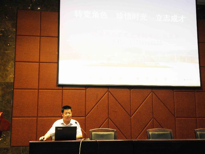在蒋林娟老师的介绍下,全体新生以热烈的掌声欢迎化学化工学院党委副书记施卫华老师作演讲。施副书记演讲主题是“转变角色、珍惜时光、立志成才”。施卫华老师结合内容丰富、形式多样的PPT演示,以生动的语言分别从转变角色、珍惜时光和立志成才三个角度为新生介绍了91快活林
