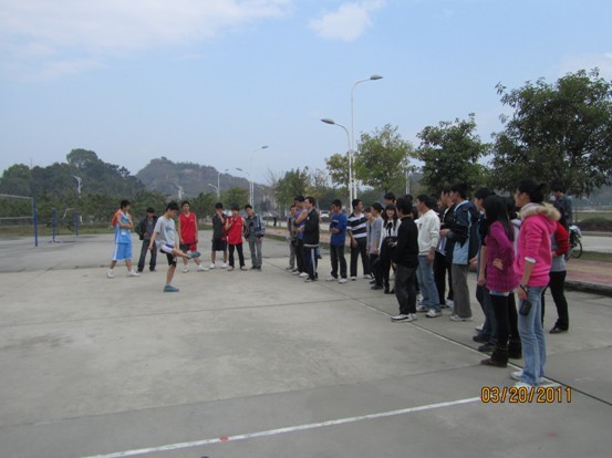 下午1时许,排球场内人头攒动,不等比赛正式开始,参赛运动员就就各自参赛项目进行热身运动,蓄势待发。下午2点,比赛正式开始,运动员们各就各位,摩拳擦掌,跃跃欲试。此次趣味运动会共设有:毽子接龙、自行车慢骑、仙人指路、十人九足4个项目。参赛队伍以班级为单位。比赛看似简单,实则不易。毽子接龙、自行车慢骑,考验个人技艺,更考验集体实力;仙人指路、十人九足,挑战熟读,更挑战协作程度。趣味盎然的运动项目,紧张激烈的比赛点燃了在场每一个同学的热情。场上运动员们尽情挥洒,场下观众则频频报以热烈的掌声和阵阵惊呼,现场气氛示范热烈。