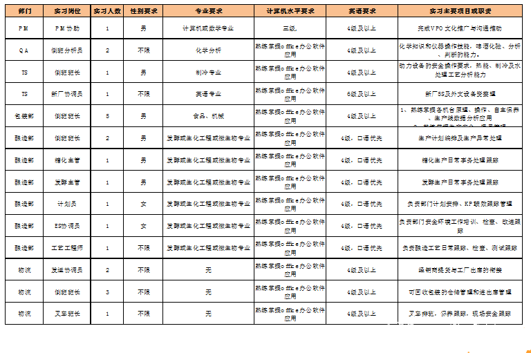 本科以上学历,机械ew/电气/自动化/食品/生物/化学等相关专业优先。