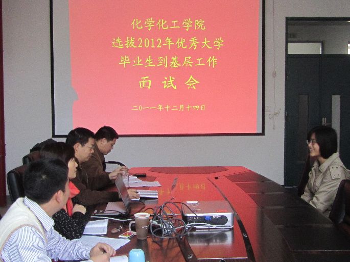 报考2012年的选调生进行考核,参加人员有学院党委书记倪朝霞、学院党委副书记施卫华、学院纪检委员李晓教授、毕业班辅导员黄寿泰、陈艺全等5人参加会议。