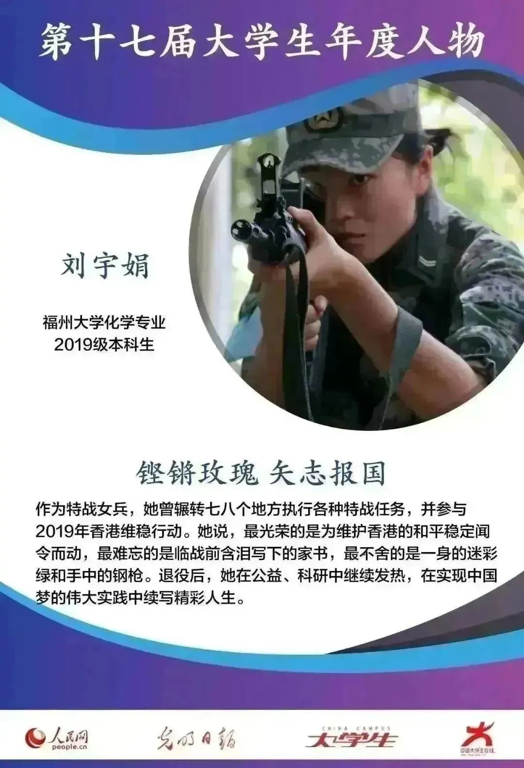 刘宇娟坚持退伍不褪色,现是福州市鼓楼区武装部预备役应急排的一名战士。在役期间,刘宇娟就常给有志军营的学弟学妹回信,回校后她积极组织每届运动会方队训练及学院征兵宣传工作,指导多名学弟学妹踏上从军路,获学院“优秀退役大学生”荣誉称号。作为一名中共党员,刘宇娟积极发挥先锋模范作用;生活中,通过勤工俭学早早实现经济完全独立。同时通过腾讯公益为白血病儿童患者、困境学生累计捐款9个多月,为社会奉献自己力所能及的爱心与力量。作为校团委学生记者,她运用部队中学到的宣传技能,在青春福大等官方平台发表多篇作品。作为校龙狮队女龙队队长,她配合教练老师组织各项训练,带领团队荣获“第13届中国大学生舞龙舞狮锦标赛甲组女子规定套路”第六名、“福州市首届舞龙舞狮锦标赛”第二名的好成绩。