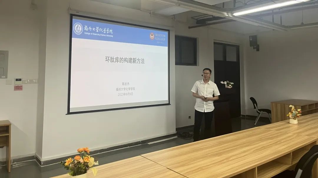 最后,陈发杰老师做了以《环肽库的构建新方法》为题的学术报告。多肽药物在疾病治疗中具有高特异性和有效性等优点。环肽分子相对于线性多肽通常具有更高的亲和力、代谢稳定性、口服利用度等成药性指标,更具开发潜力。陈发杰老师的研究方向为多肽化学生物学,基于噬菌体展示的环肽药物筛选,从而快速获得包含数千种骨架结构的环状噬菌体多肽库。环状多肽库的构建在化学选择性、位点选择性、生物兼容性等多个方面的挑战还亟待探索。有研究表明,让链状的多肽“成环”可以在结构坚固性、细胞跨膜性、代谢稳定性等多个方面显著提高多肽的成药性。因此该环状多肽库在药物研发领域也具有广泛应用。