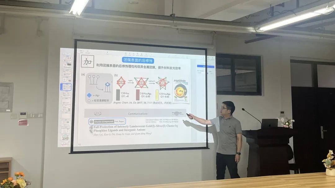 活动伊始,雷震老师做了以《金(亚)纳米团簇的表面工程》为题的学术报告。雷震老师的学术研究围绕金团簇展开,研究有明确分子结构的金亚纳米团簇,并向我们介绍了团簇体系的特点:体系的复杂性,需要从合成、结构、构效关系三个方面来考虑解决问题。金亚纳米团簇的表面工程分为换、拆、加、组四个层面展开,从配体效应的角度出发,通过配体的换、拆、加、组等策略对金纳米团簇的发光性能进行有效调控等。