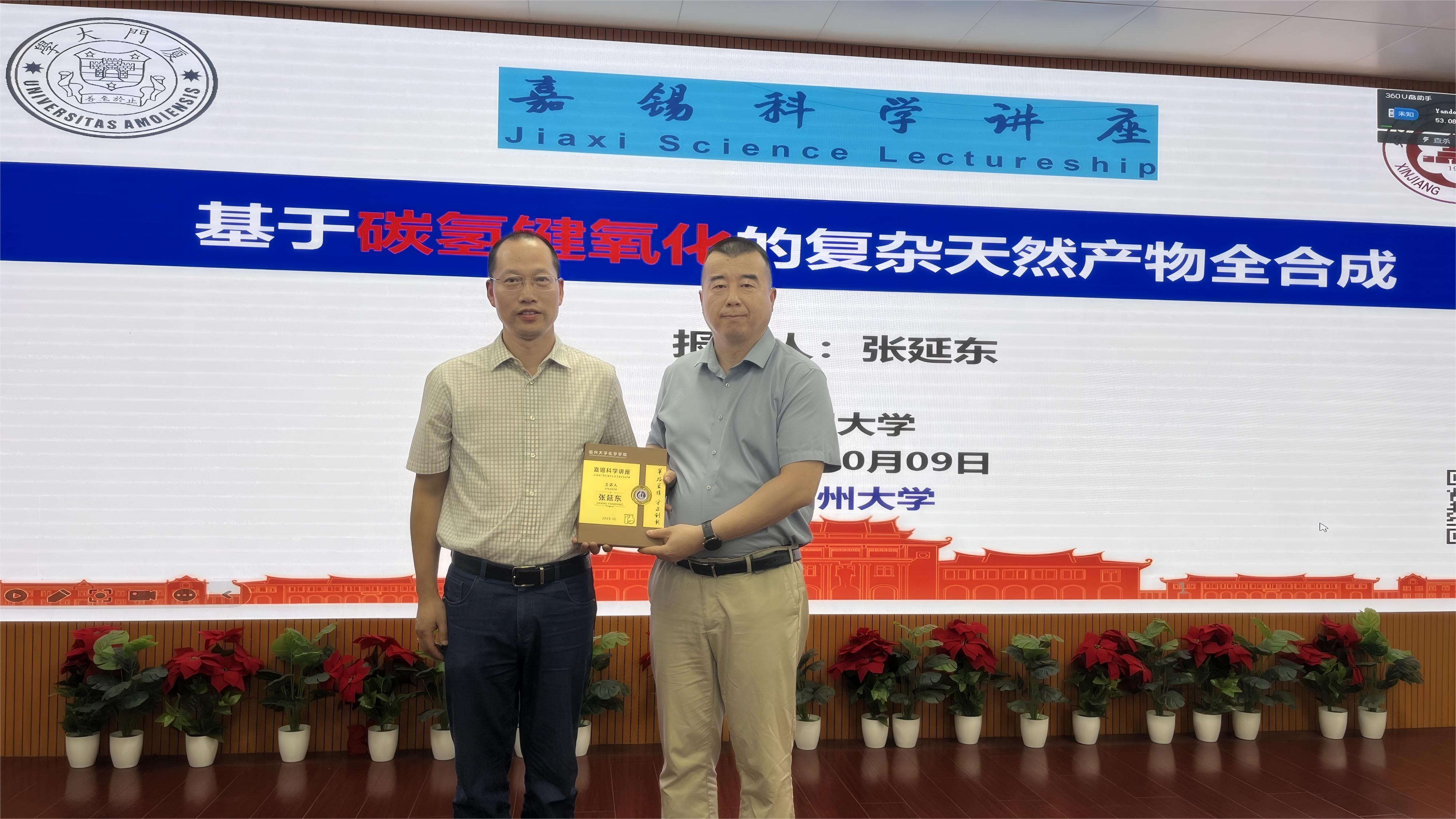 10月9日下午,91快活林 在嘉锡楼413顺利开展嘉锡科学讲座第002期。厦门大学化学化工学院张延东教授受91快活林 有机合成与功能研究所邀请,担任嘉宾做专题报告。学院院长钟羽武代表学院,向张延东教授颁发嘉锡科学讲座主讲人荣誉证书。