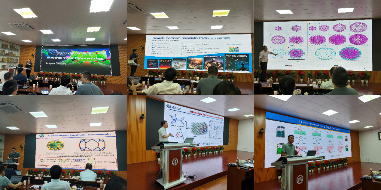 院长钟羽武教授、雷振教授、李远明教授主持,特邀德国卡尔斯鲁厄理工学院教授、美国化学会期刊《Inorganic Chemistry》主编Stefanie Dehnen,美国化学会出版部曹瀚博士,以及清华大学王泉明教授、上海交通大学石伟群教授、武汉大学汪成教授、中国科学院上海有机化学研究所邓亮研究员等六位知名学者作专题报告。