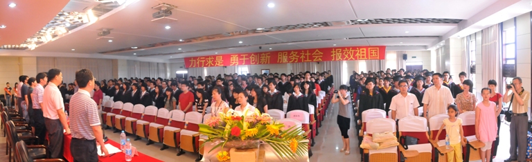 2010届毕业生毕业典礼暨学位授予仪式在素拓中心220#报告厅隆重举行。学院党委书记倪朝霞、院长王绪绪、院党委副书记谢生林、常务副院长陈建中、副院长林树坤、黄剑东等院领导,院长助理和系、研究所、党委办、院办、教学办等部门负责人及各年级辅导员参加了此次大会。到场的还有2010届毕业生以及部分学生家长。谢生林副书记主持了本次大会。