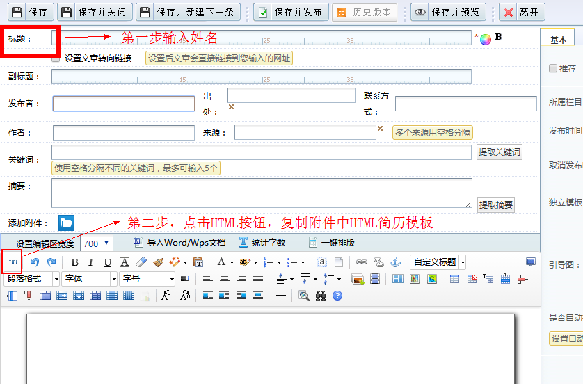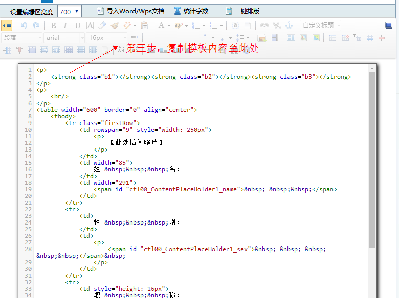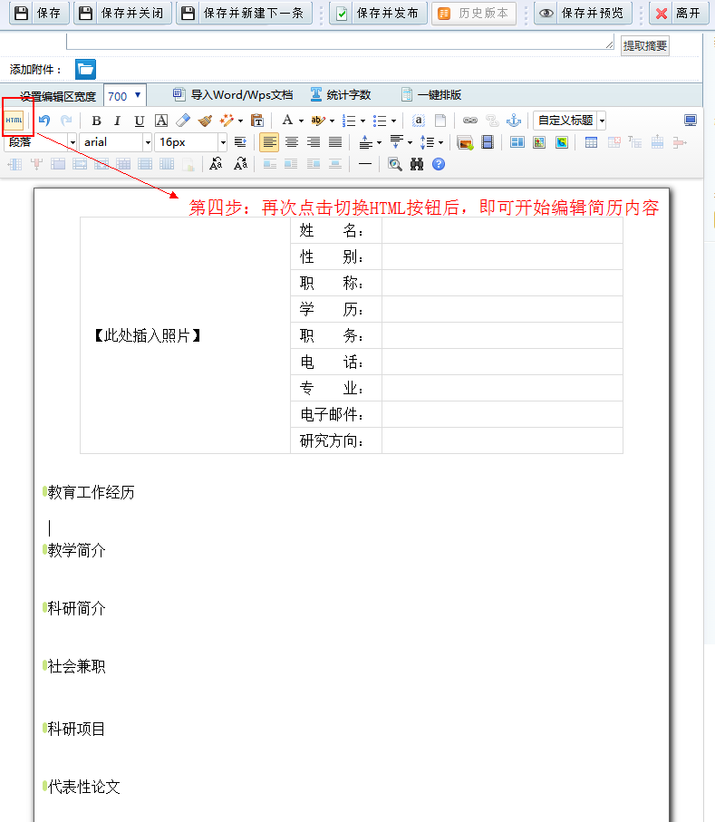 第四步:再次点击“HTML”按钮至正常页面,即可开始编辑简历内容,如下图