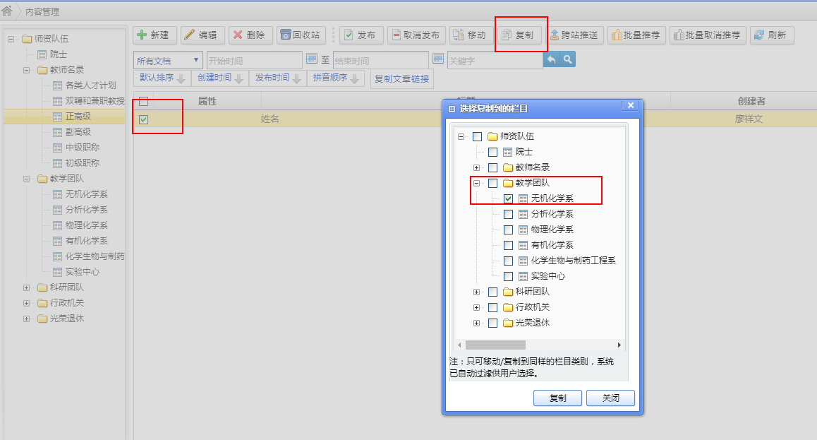 ”按钮,将选中的内容复制到相同栏目类别栏目中。