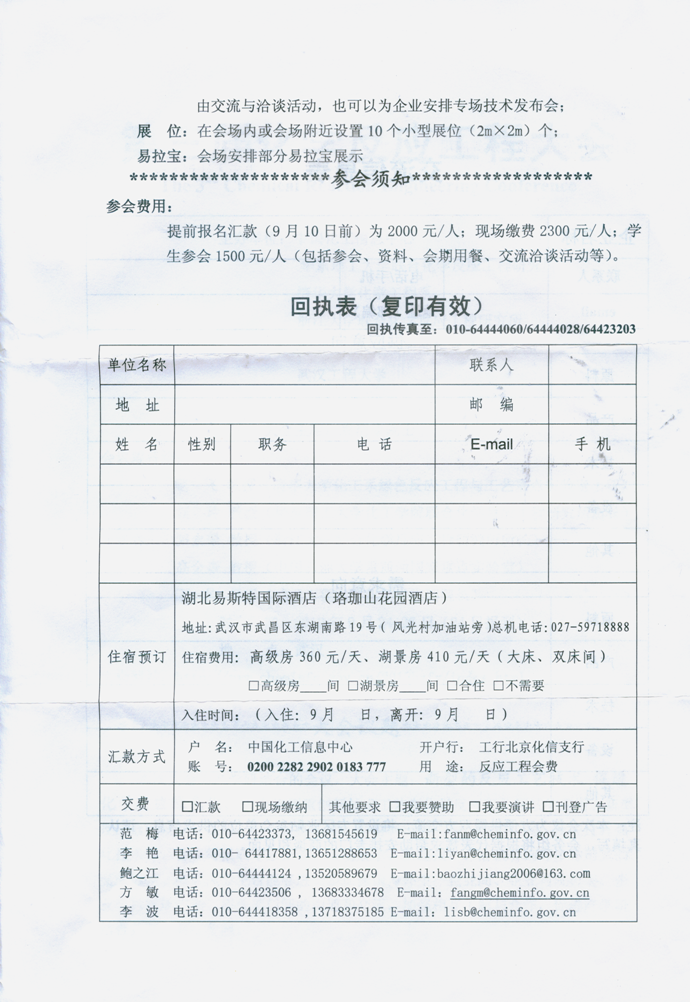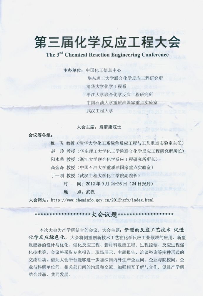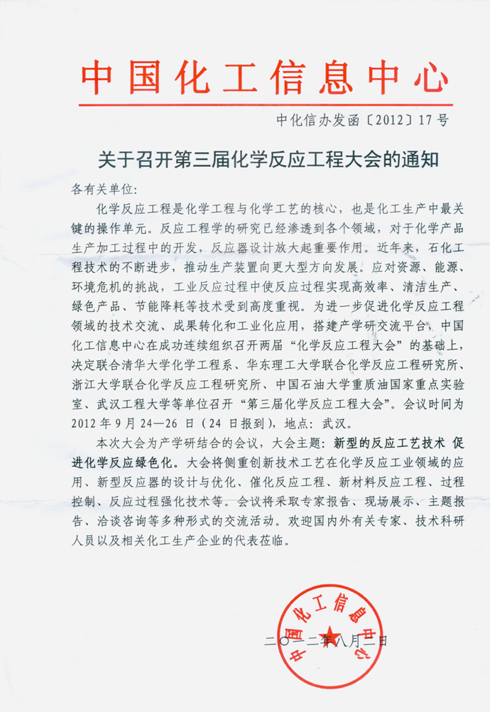 中国化工信息中心于2012年9月24-26日在武汉召开第三届化学反应工程大会,大会详细通知见附,请有意参会的老师到学院科研办(嘉锡楼403,22866337)复印参会回执表。