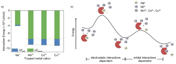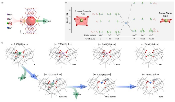 研究结果表明,高核多铌氧簇具有独特的近二十面体的类病毒核壳结构,其表面的十二个{Nb6}单元构成了六对的具有C2v对称性螯合腔的无机“分子镊子”。每一对“分子镊子”均限域了一类特征的六配位三棱柱配位场,并在其配位场的中心捕获了一个Na离子。由于六对“分子镊子”均匀地分布在球形高核多铌氧簇的表面,使每个团簇分子宛如“分子章鱼”,可以通过释放Na离子来捕获外界金属离子。首先,其配位构型随着被捕获的金属离子的不同可以呈现出不同的配位构型,如平面四方形配位的Cu2+离子和三棱柱配位的Mn2+或Co2+离子。其次,这些纯无机“分子镊子”并不是刚性的,而是呈现出一定的柔性,这些“镊子的开口”通过在一定范围内的张合来适应及捕获不同半径的金属离子。再者,“分子镊子”对不同金属离子的捕获优先级不同,其选择性顺序为Cu2+ > Co2+> Mn2+> Na+,但完全排斥Ni2+离子。通过对这种独特的螯合腔的晶体场稳定化能和各种金属离子的水合能的分析,研究者对上述现象进行了合理的解释。值得注意的是,该团簇展示的对Cu离子特别偏好和Ni离子排斥的行为与哺乳动物中蛋白酶对Cu和Ni离子的选择性偏好类似,是一种可用于仿生应用的潜在无机模拟物。最后,通过密度泛函理论计算、时间依赖性的离子交换单晶结构分析和荧光测试,研究者揭示了“分子镊子”和过渡金属离子之间的类SN1反应的交换机制,其离子交换过程可以分为两步。第一步,随着二价金属离子接近分子镊子,它们可以使分子镊子内部的静电势显著增加,增加的静电势驱动Na+离子的洗脱以降低系统能量,该过程由静电相互作用控制;第二步,金属离子进入配位场中心进一步降低系统能量,该过程由轨道相互作用决定。