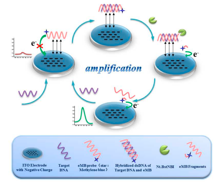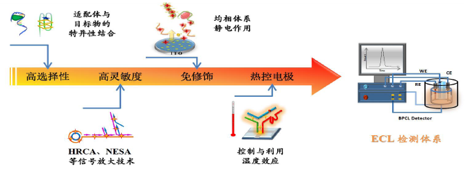 体系的温度不但会改变反应速率,也会影响ECL试剂的发光效率,进而影响ECL的检测性能。传统的ECL传感器大多是通过溶液整体加热的方法来控制反应体系中的温度,操作繁琐且不利于现场检测。热电极具有快速精准的控温能力,实现原位控温分析,该课题组首次将热控电极应用于电化学发光体系,构建了高灵敏的基于热控电极的ECL传感界面。DNA间的相互作用以及功能核酸与目标物之间的作用一般需要调控温度,传统方法也是通过溶液整体加热实现,该课题组首次将热控电极应用于基于功能核酸的ECL传感界面的构建,开发了一系列操作简便、灵敏度高、抗干扰性好的ECL传感器,实现了目标物的高效分析检测。利用热控电极不但可以容易控制DNA杂交和功能核酸与目标物的相互作用温度,而且通过热电极适当提高电极表面的温度,可进一步提升ECL发光性能。开发的基于热控电极的ECL传感器用于重金属Pb2+的分析测定。同时利用热控电极控制DNA杂交以及酶反应所需要的温度,结合信号放大策略,构建了高灵敏的检测双酚A以及OTA等的ECL传感器。