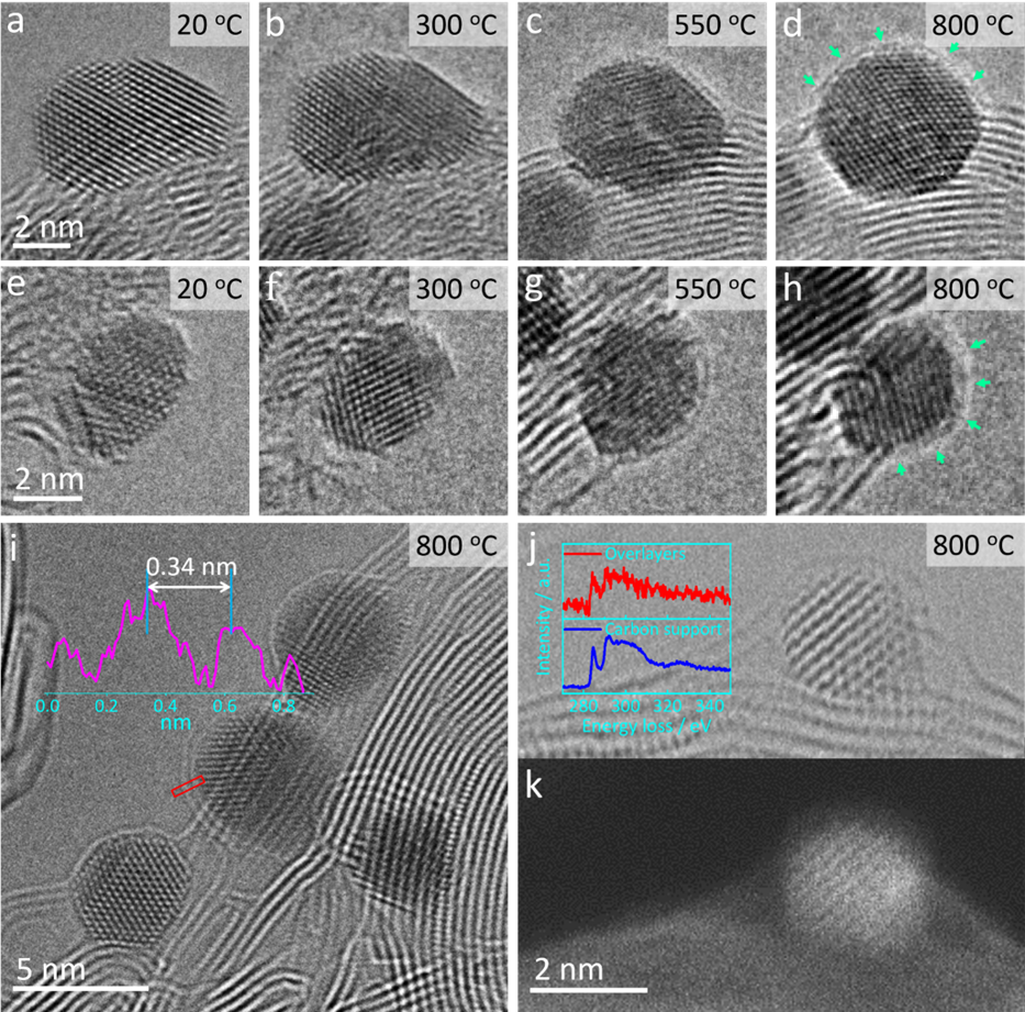 Figure 2. (a-d, e-h) In situ HRTEM images of Ir/C recorded during the temperature increase from RT to 800 °C. In situ (i) HRTEM, (j) BF-STEM, and (k) SE-STEM images of Ir/C recorded at 800 °C showing the formation of a carbon overlayer on Ir NPs (green arrows). Inset in (i) shows the lattice d-spacing (0.34 nm) of the overlayer. Inset in (j) shows EELS spectra recorded from the overlayer and from the carbon support (red and blue traces, respectively), evidencing that the encapsulated layer is carbon