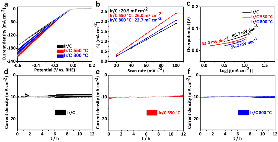 Figure 6. (a) Linear sweep voltammetry (LSV) curves of Ir/C, Ir/C 550 °C and Ir/C 800 °C electrodes in 1 M KOH. Traces represent the standard deviation from three independent measurements. (b) Capacitive currents as a function of scan rates. (c) Tafel plots of the corresponding electrodes (d-f) Current–time curves of Ir/C, Ir/C 550 °C and Ir/C 800 °C electrodes. Traces represent the standard deviation from two independent measurements.