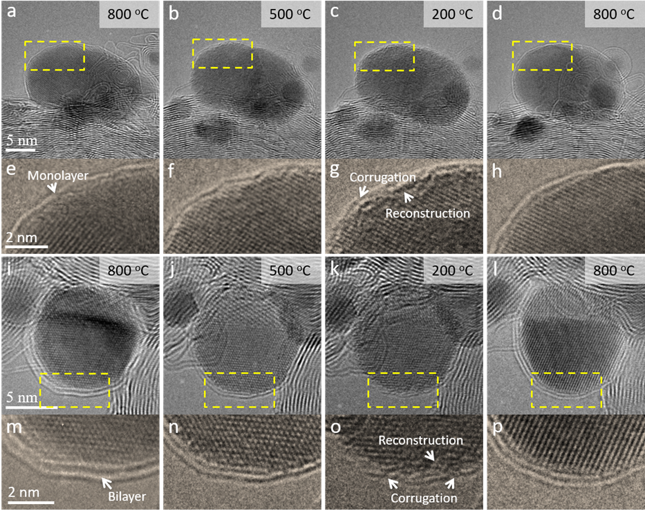 Figure 3. In situ atomic-scale observation of the change of the overlayer and interfacial structure during temperature decrease from 800 °C to 500 °C, and 200 °C and finally increase to 800 °C. (a-d) A monolayer carbon-covered particle. (e-h) Enlarged images within dotted rectangles indicated in (a-d). (i-l) A bilayer carbon-covered particle. (m-p) Enlarged images within dotted rectangles indicated in (i-l).