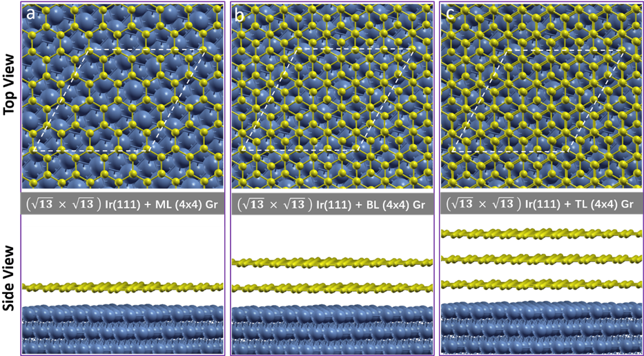 Figure 5. Top view and cross-section view of the structural models of (a) monolayer (b) bilayer (c) trilayer graphene (Gr) on Ir(111). Blue spheres represent Ir atoms and yellow spheres represent C atoms. Unit cell used for the calculations are marked with white dashed lines.